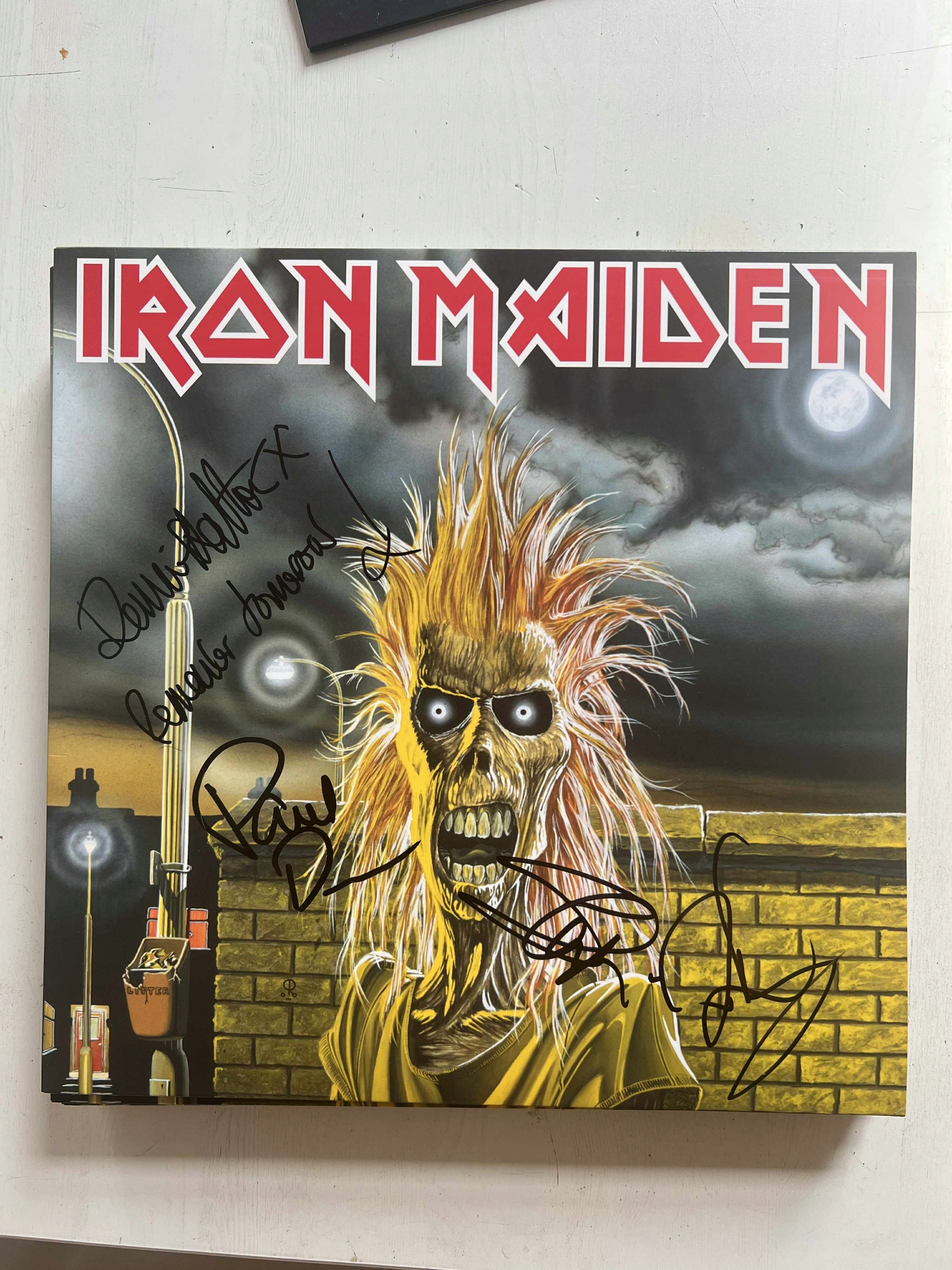 вінілова пластина з автографами Паула ді Анно, Стіва Харріса, Дейва Мюррея та Денніса Страттона.