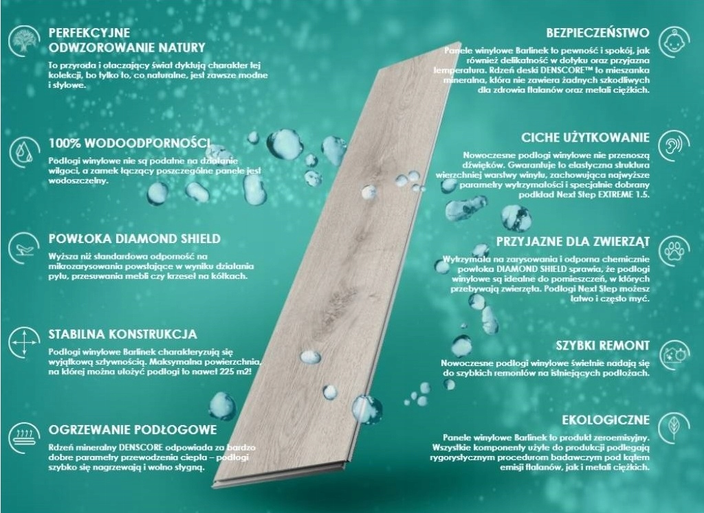 Вінілові підлоги Barlinek характеризуються винятковою довговічністю. Це забезпечує серцевина DENSCORETM, виготовлена з дружніх інгредієнтів. Побудована таким чином підлога має виняткову стійкість і не деформується під впливом температури. Ще однією перевагою вінілових підлог є їх стійкість до інтенсивного використання вище середнього, тому вони вважаються найдовговічнішими на ринку! МІЦНИЙ ТА НАДЗВИЧАЙНО МІЦНИЙ.