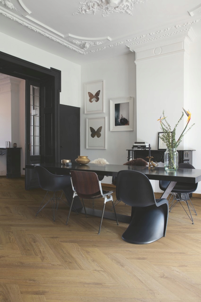 Колекція вінілових підлогових покриттів Pristine herringbone є відображенням нашого прагнення до досконалості. Він поєднує в собі класичний і сучасний дизайн, щоб зробити ваш домашній декор привабливим.