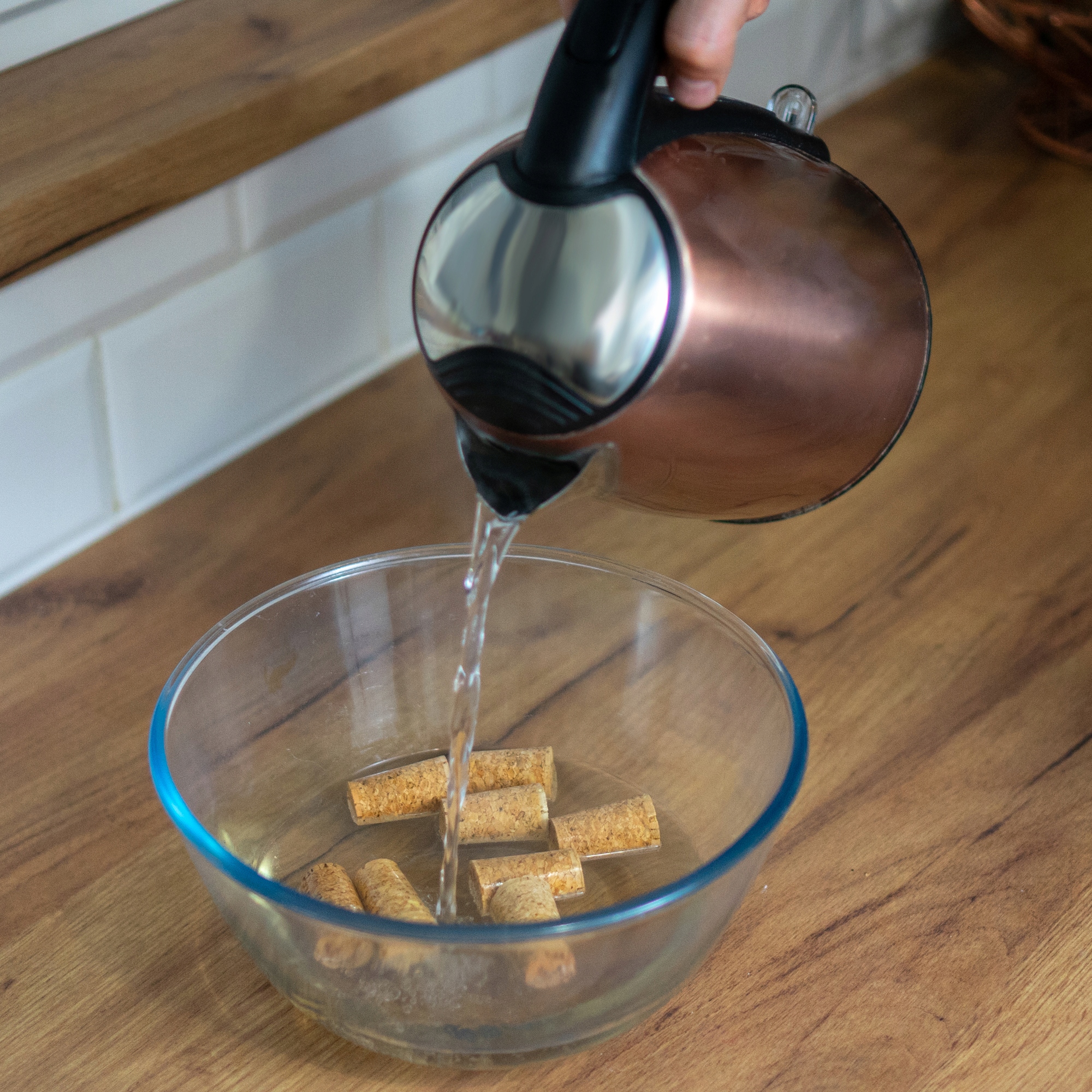 - Простий у використанні - перед закупорюванням просто занурте пробки в гарячу воду приблизно на 3 хвилини або покладіть їх накриті окропом. Це зробить їх більш пластичними, що спростить закупорювання пляшок.