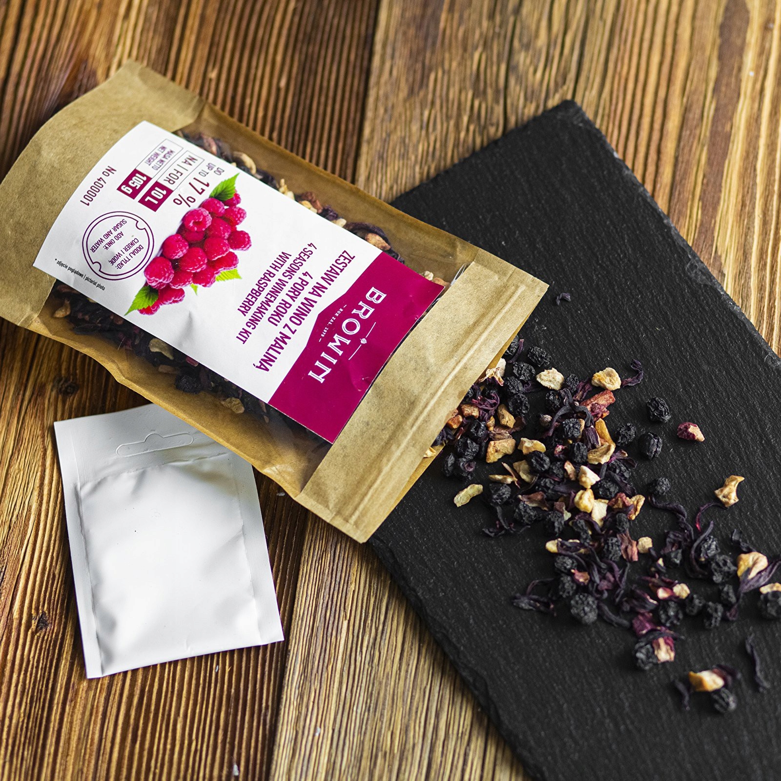 4 СЕЗОНИ - МАЛИНА - це набір для виготовлення вина, що містить ретельно відібрані сухофрукти та квіти та суміш винних дріжджів з поживними речовинами.