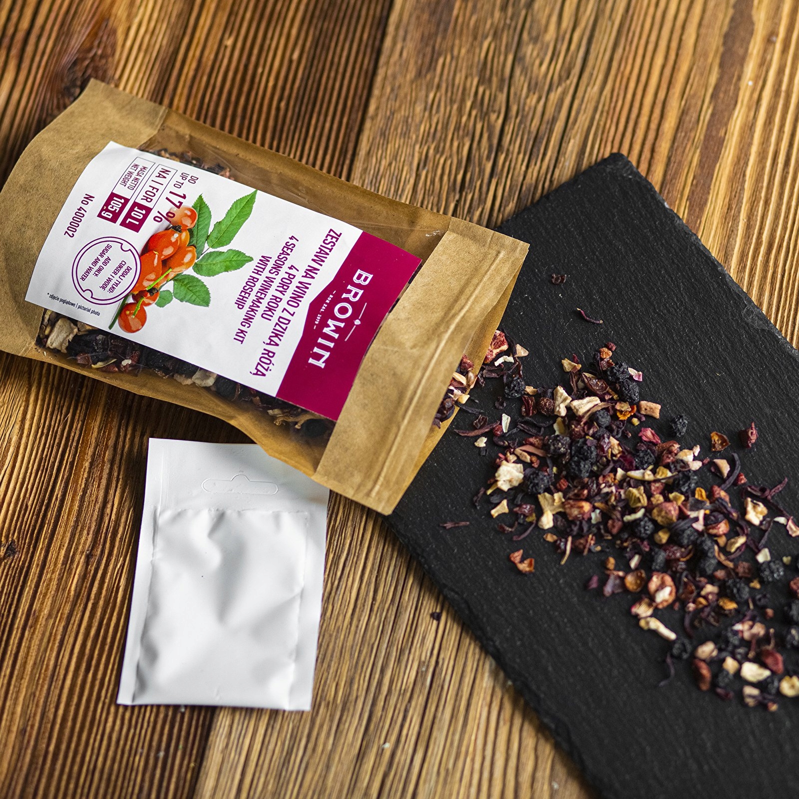 Інгредієнти сушені: шкірка шипшини, яблуко, квітка гібіскуса, плоди чорноплідної горобини, аромат. ], гідрофосфат (V) діамонію, вітамін В1 (тіаміну гідрохлорид)