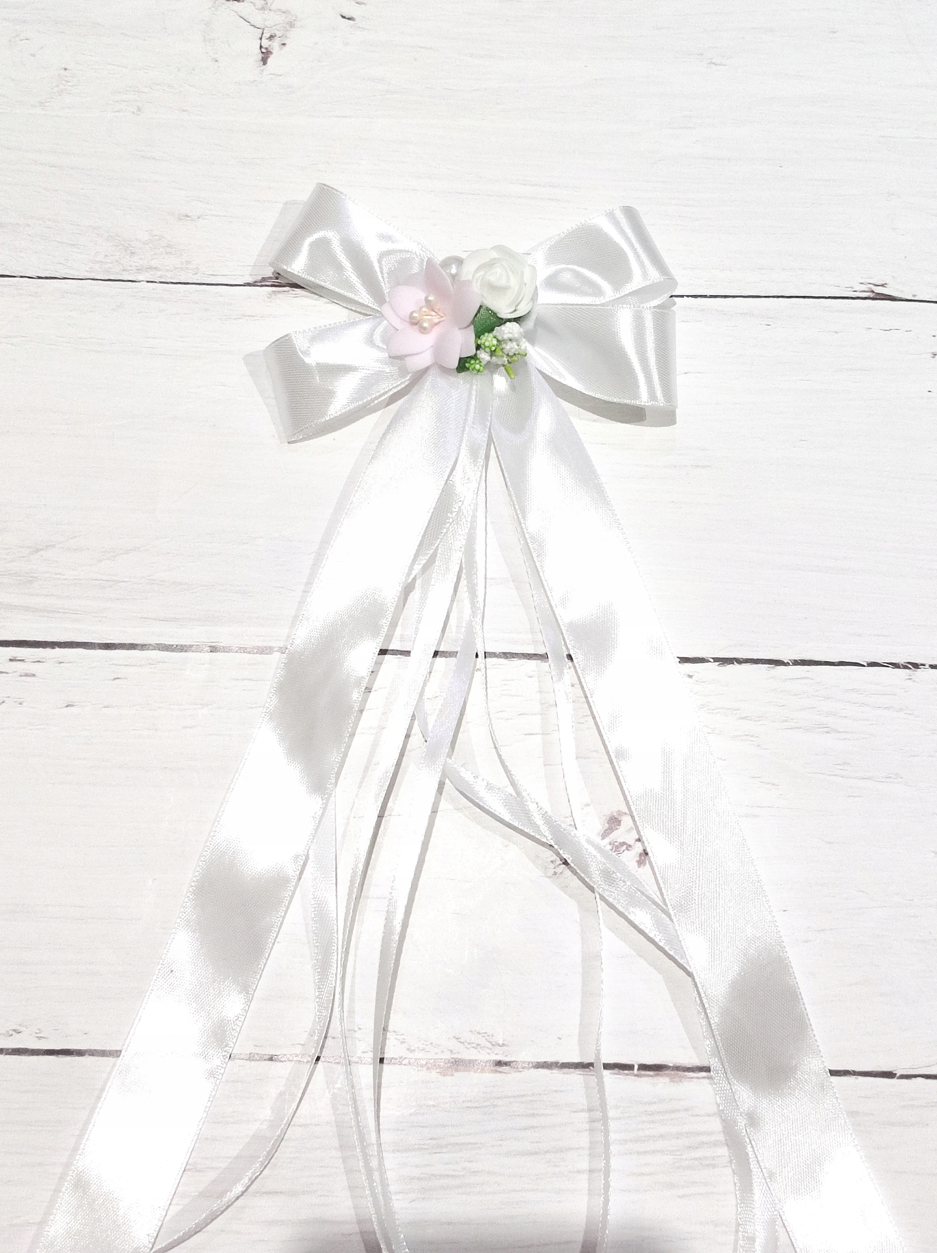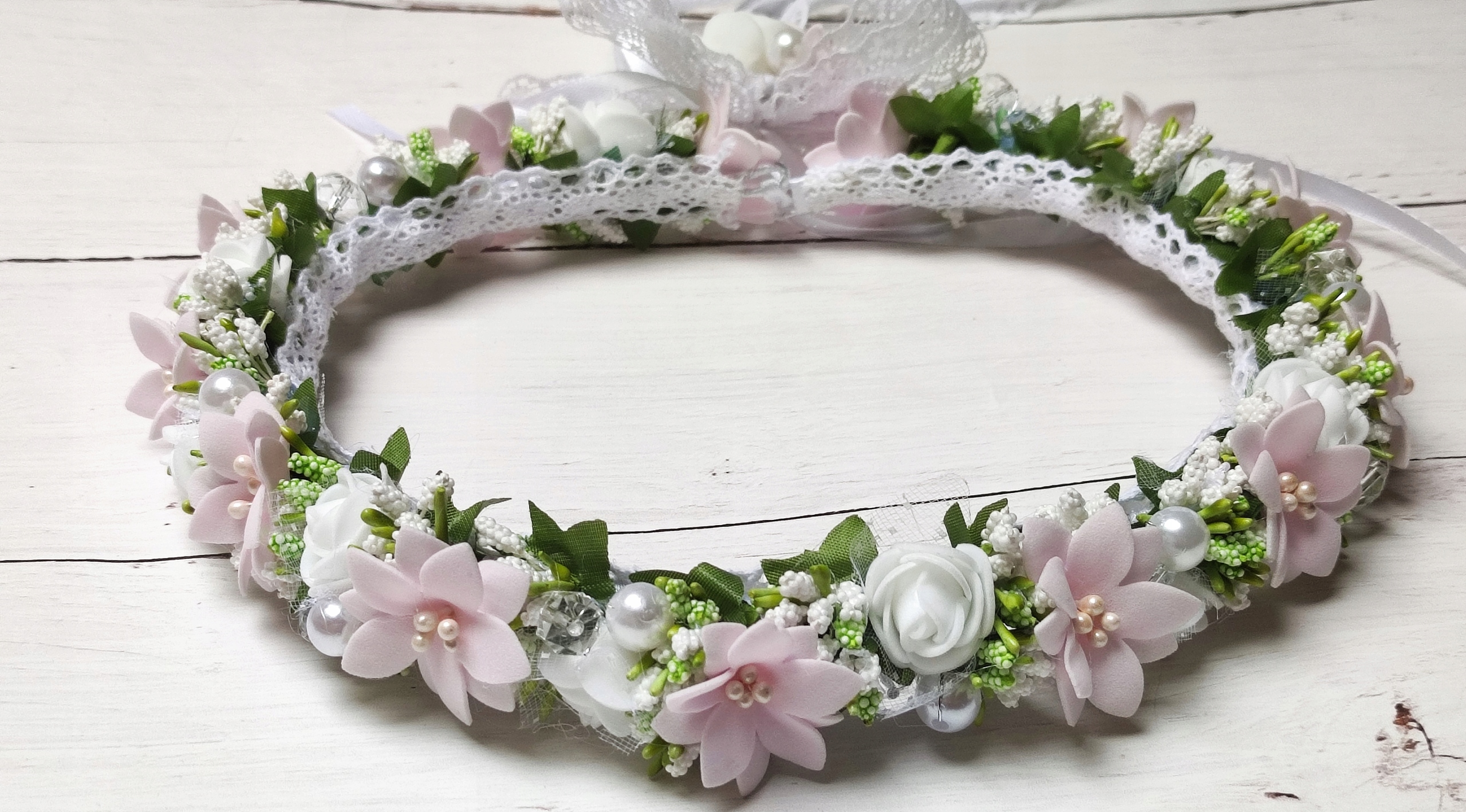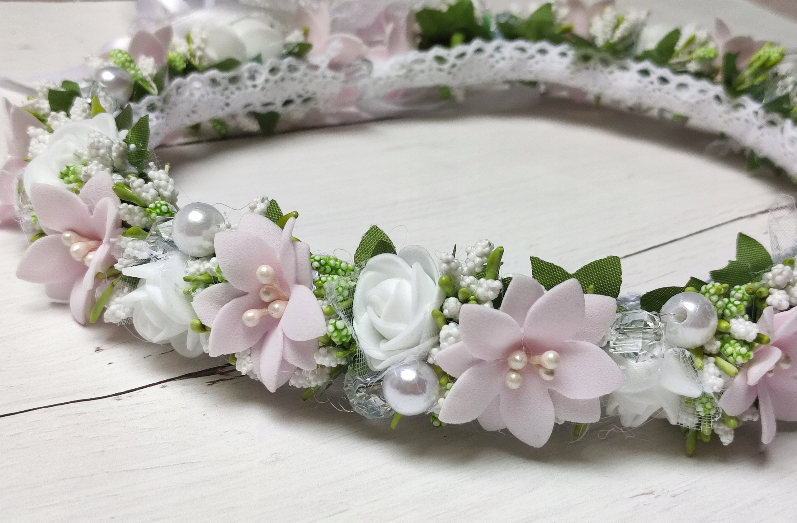 Віночок створений з троянд з пінопласту та ніжних рожевих квітів, перлів з діамантами та квіткових аксесуарів. Квіти виглядають дуже реалістично, завдяки чому дівчина виглядає ніжною та елегантною в день Святого Причастя.