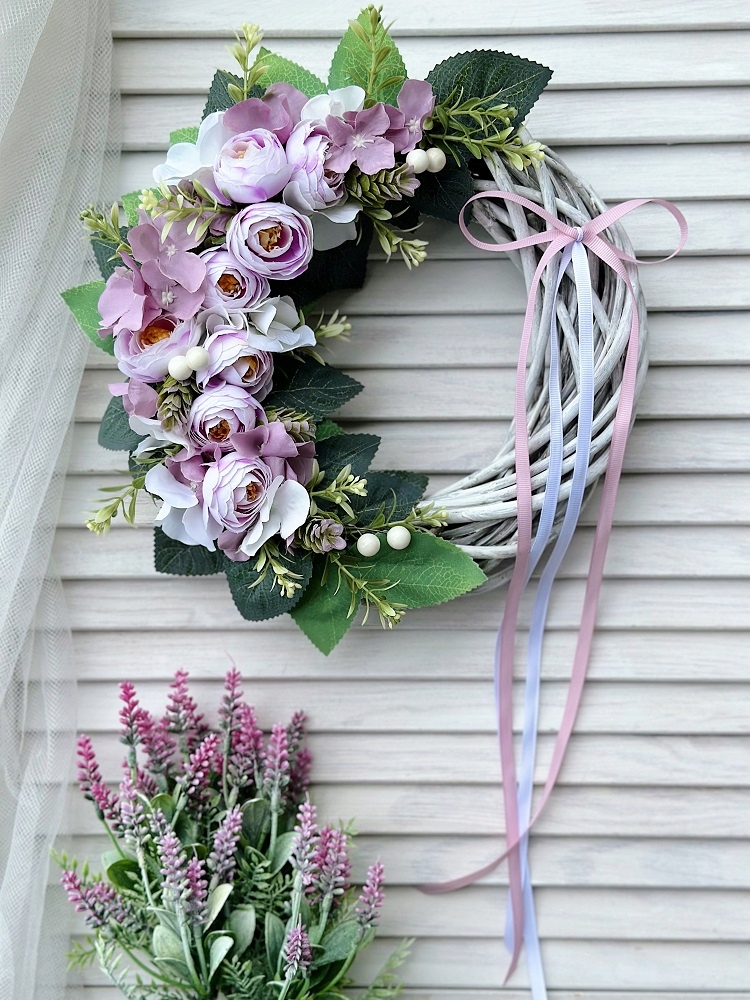Квітковий вінок, прикрашений штучними квітами бузкових відтінків і різноманітними аксесуарами, листям і бантом.