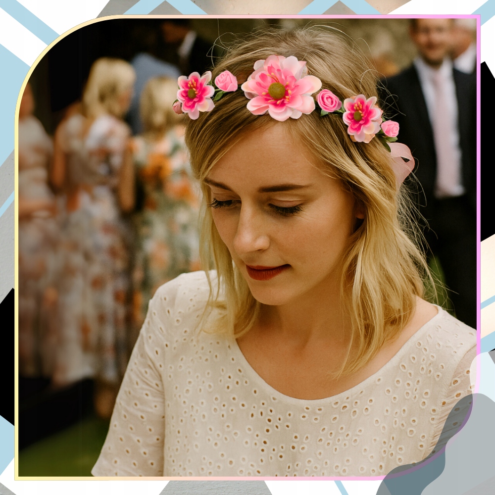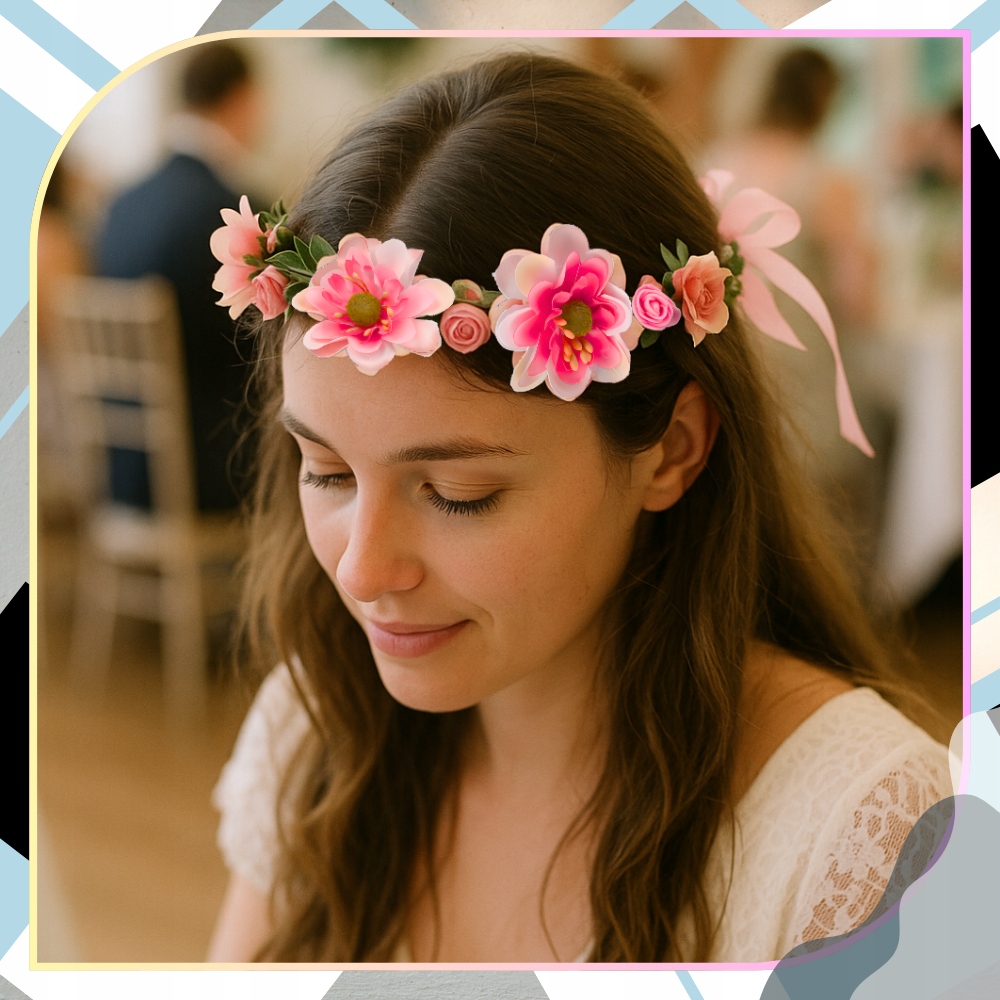 ✅ Завдяки регульованому обхвату (приблизно 54 см) і зручній стрічці, що зав'язується ззаду, вінок легко пристосовується до будь-якої голови, не створюючи жодного тиску. Він ідеально підійде як для дорослих жінок, так і для дівчат - наприклад, як вінок для причастя або для подружок нареченої.