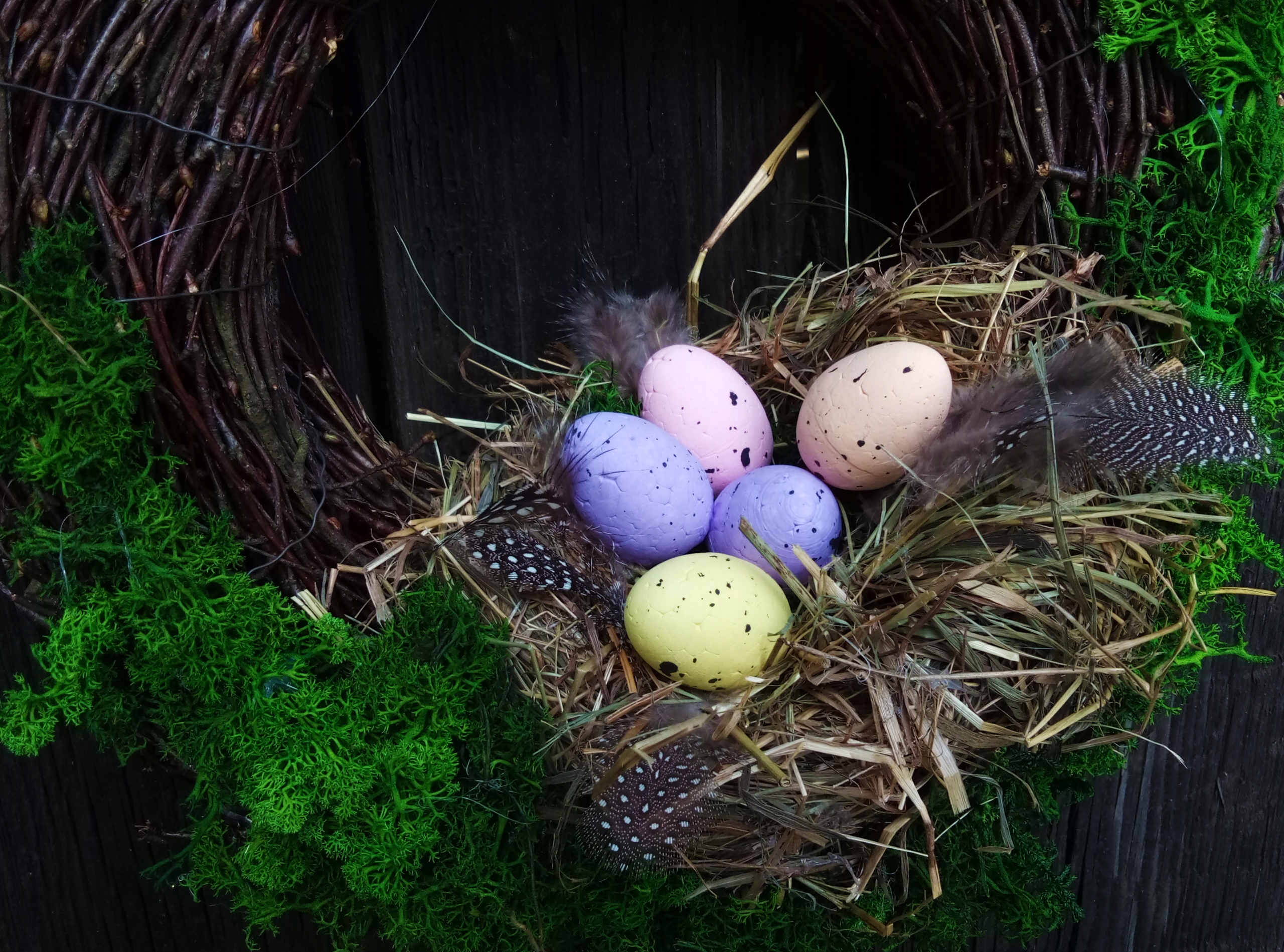 - оздоблений мохом, мохом (середньозеленого кольору), пінопластовими яйцями, сіном, пір’ям.