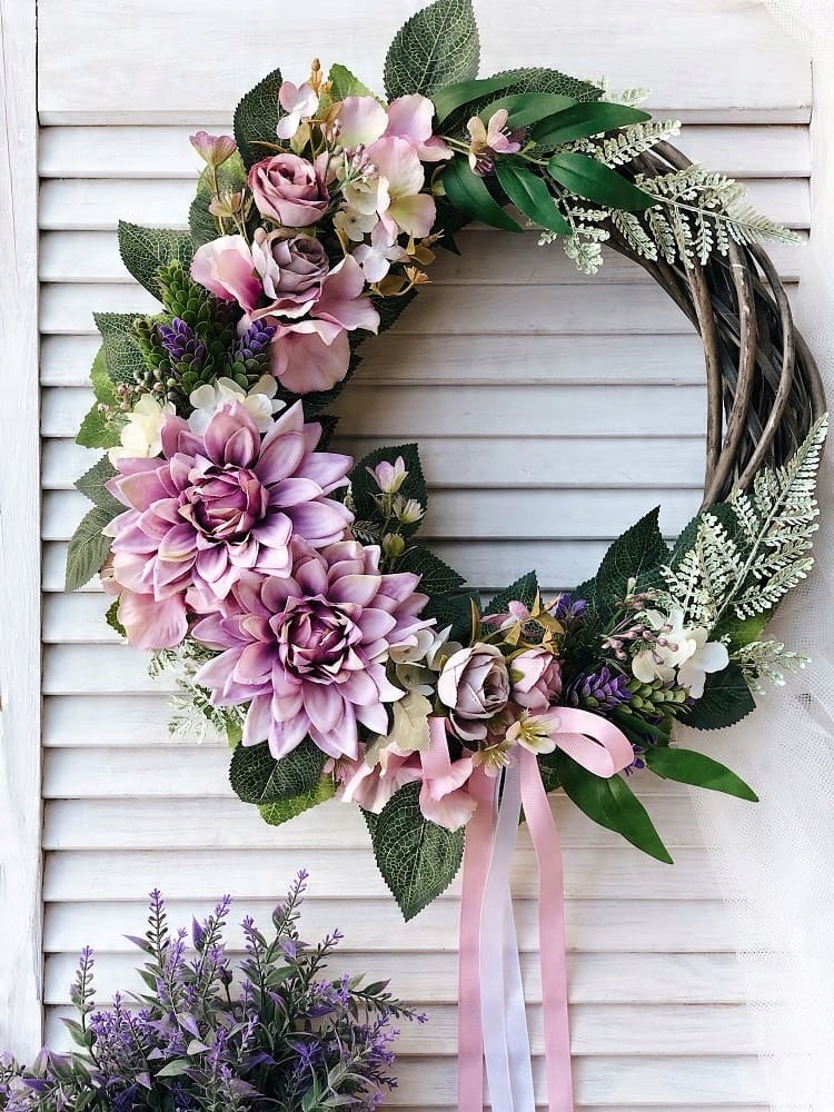 Чарівний, романтичний віночок, прикрашений штучними квітами бузкових і фіолетових відтінків і різноманітними аксесуарами, листям і бантом.