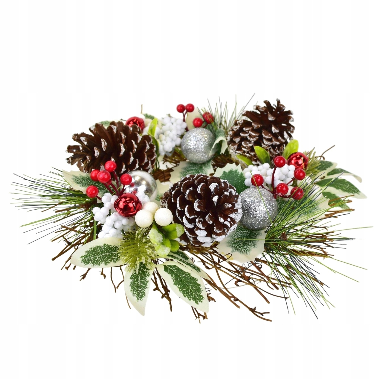 - дизайн: шишки, зелені та соснові гілочки, срібні кульки, білі ягоди