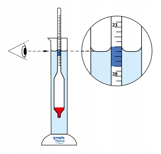 Нижнє показання - відповідно до доданої інструкції "на око", завдяки цьому виноміру ми можемо досить точно визначити концентрацію алкоголю в ферментованому вині, цукрової партії - цукру.
