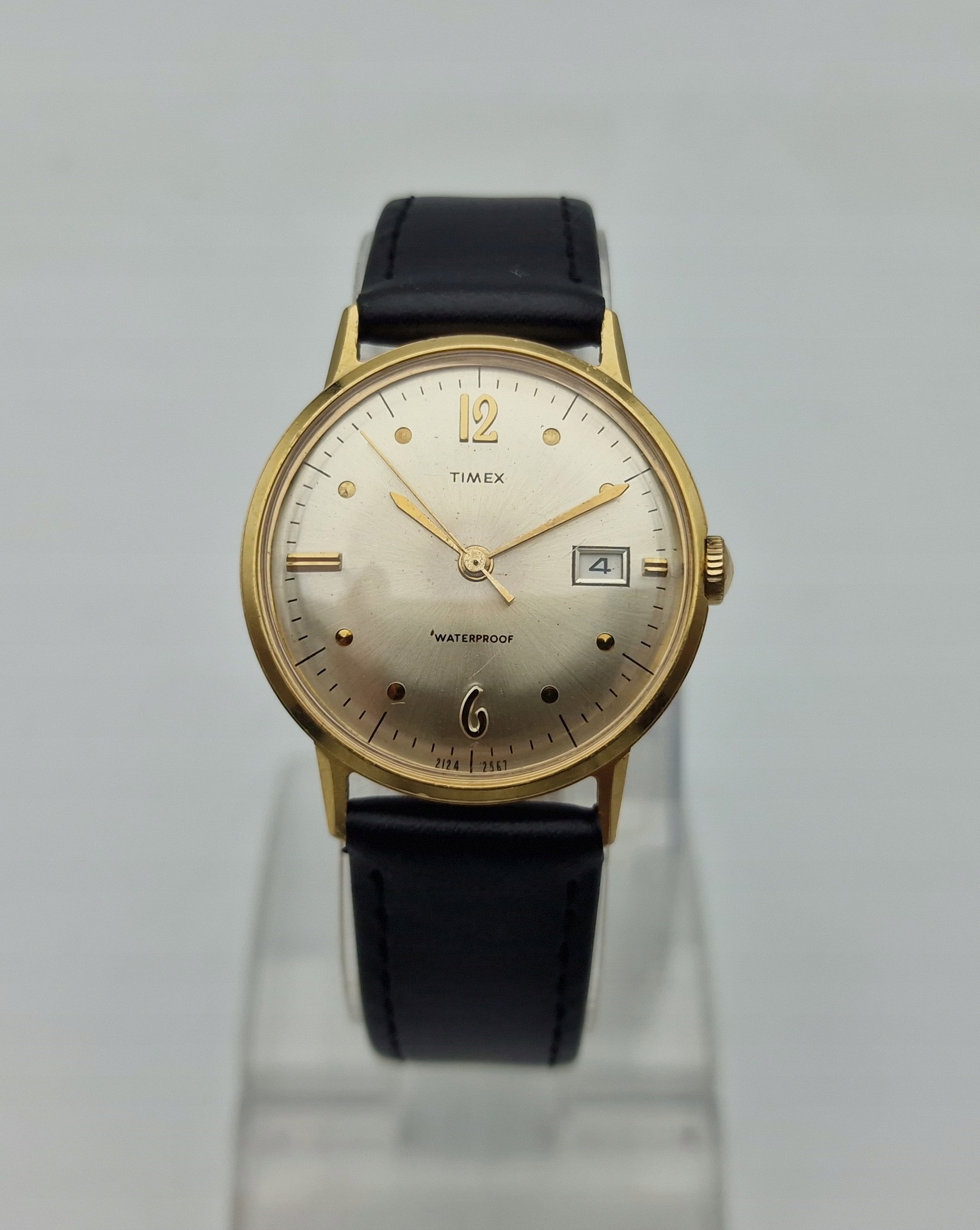 - Срібний металевий циферблат із золотими годинниковими мітками та відображенням дати на 3 годині. Оригінальний циферблат із підписом: "TIMEX, WATERPROOF". Циферблат в ідеальному стані, не реставрований.