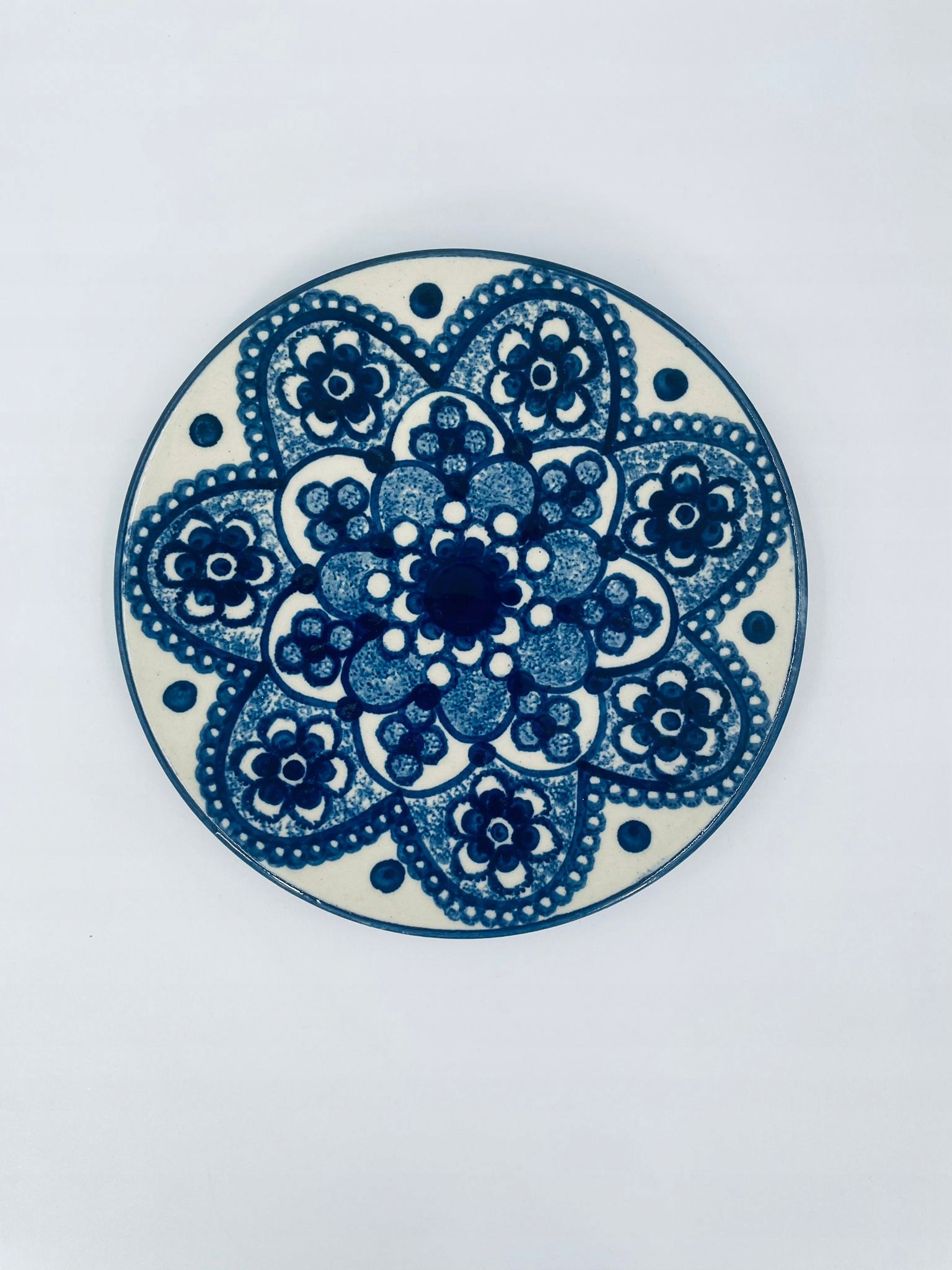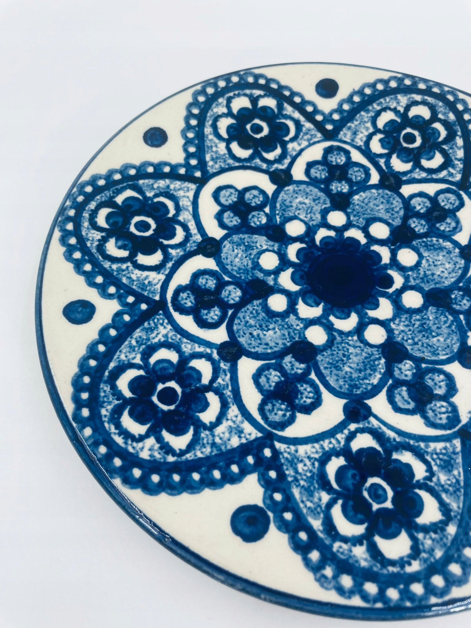 Декоративна тарілка у вінтажному стилі, виготовлена з кераміки кольору екрю. Тарілка характеризується декором, розписаним вручну синім кобальтом.
