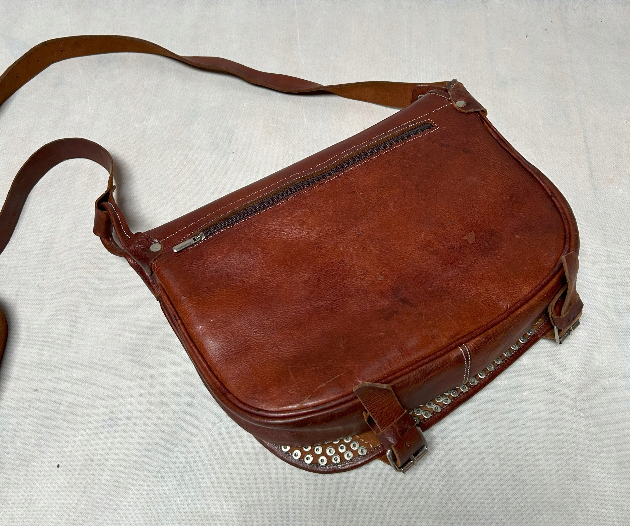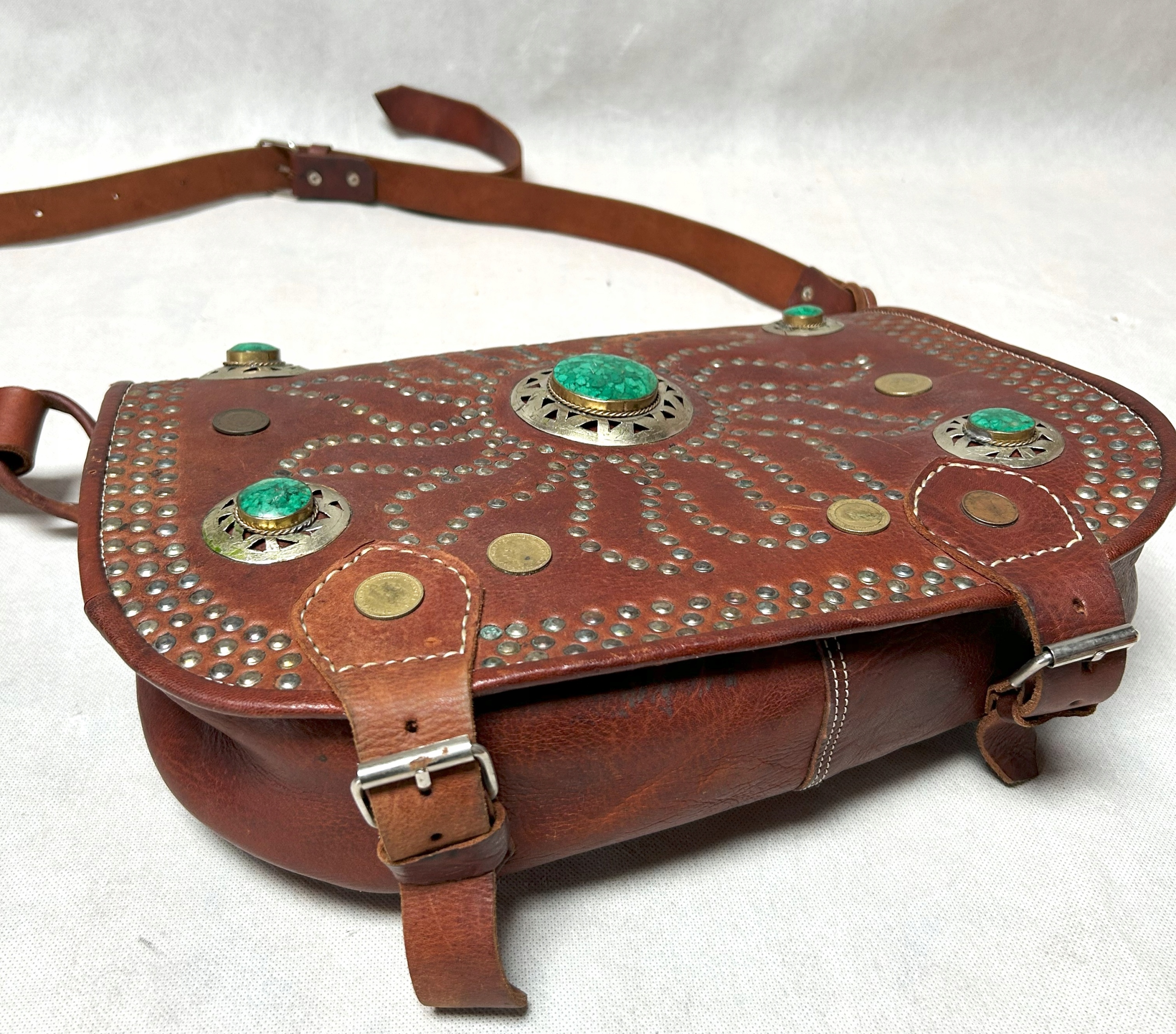Марокканська шкіряна сумка з монетами, латунними шпильками, великим срібним медальйоном і чотирма меншими медальйонами з камінням смарагдового кольору. Застібка на пряжці, 2 кишені на блискавці, кишеня на застібці та плечовий ремінь.