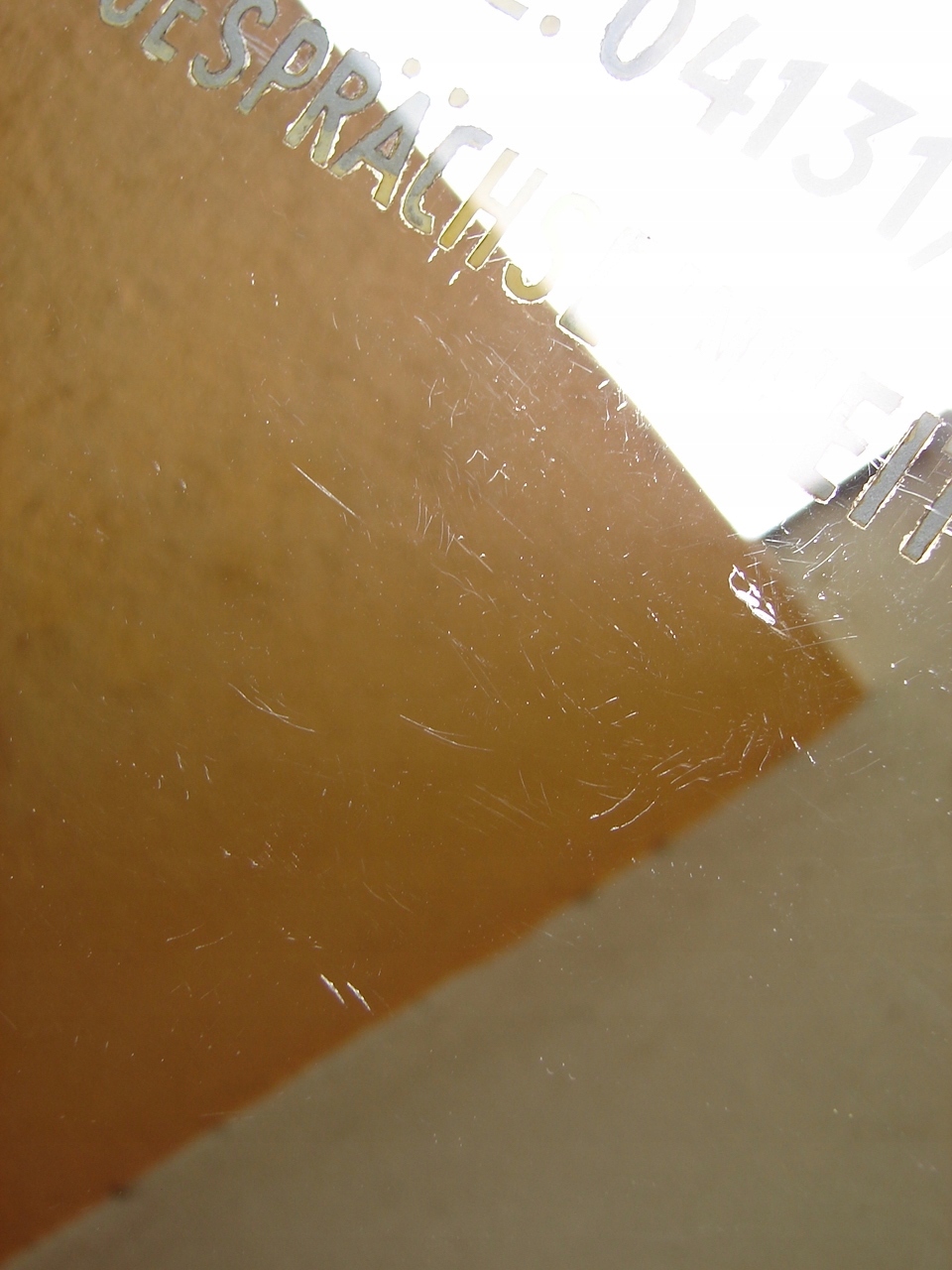Дзеркало без тріщин має сліди використання та віку у вигляді подряпин. Задня частина проклеєна гумовим матеріалом, який пахне старовиною.