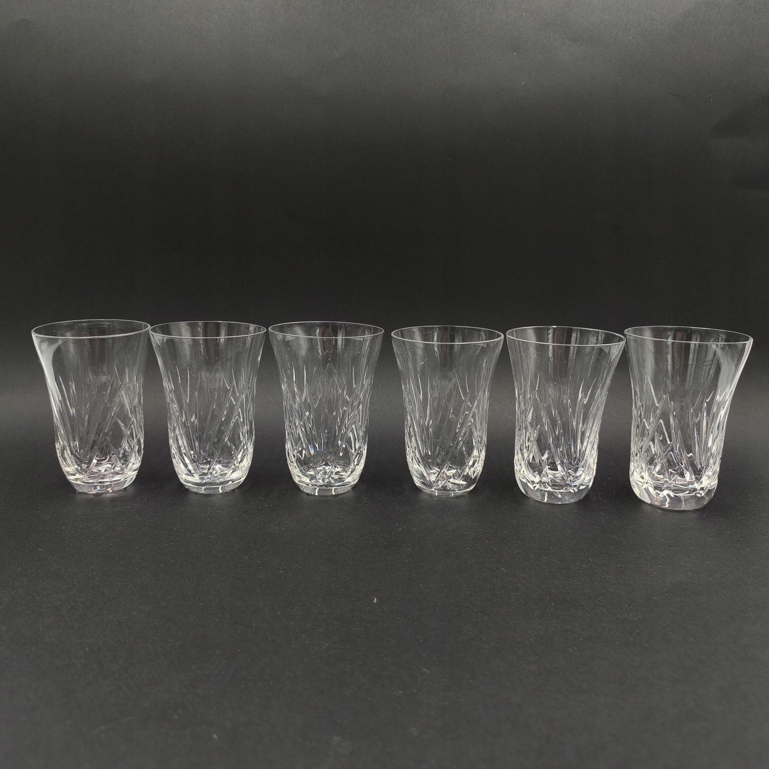 Продається елегантний набір з шести скляноктонкої форми, трохи розширюється до верху. Кожен з них прикрашений тонким геометричним вирізом, який чудово розсіює світло та надає келихам неповторного блиску.