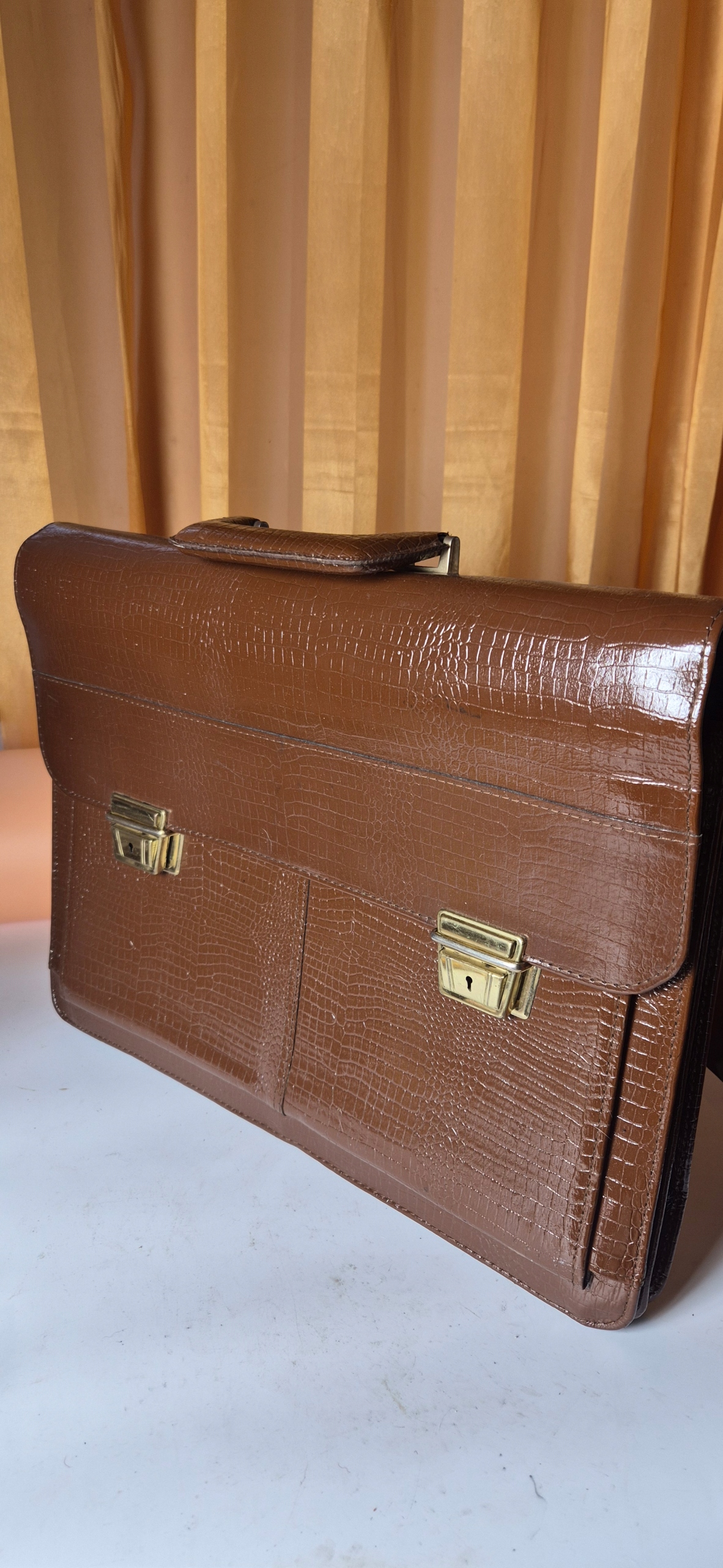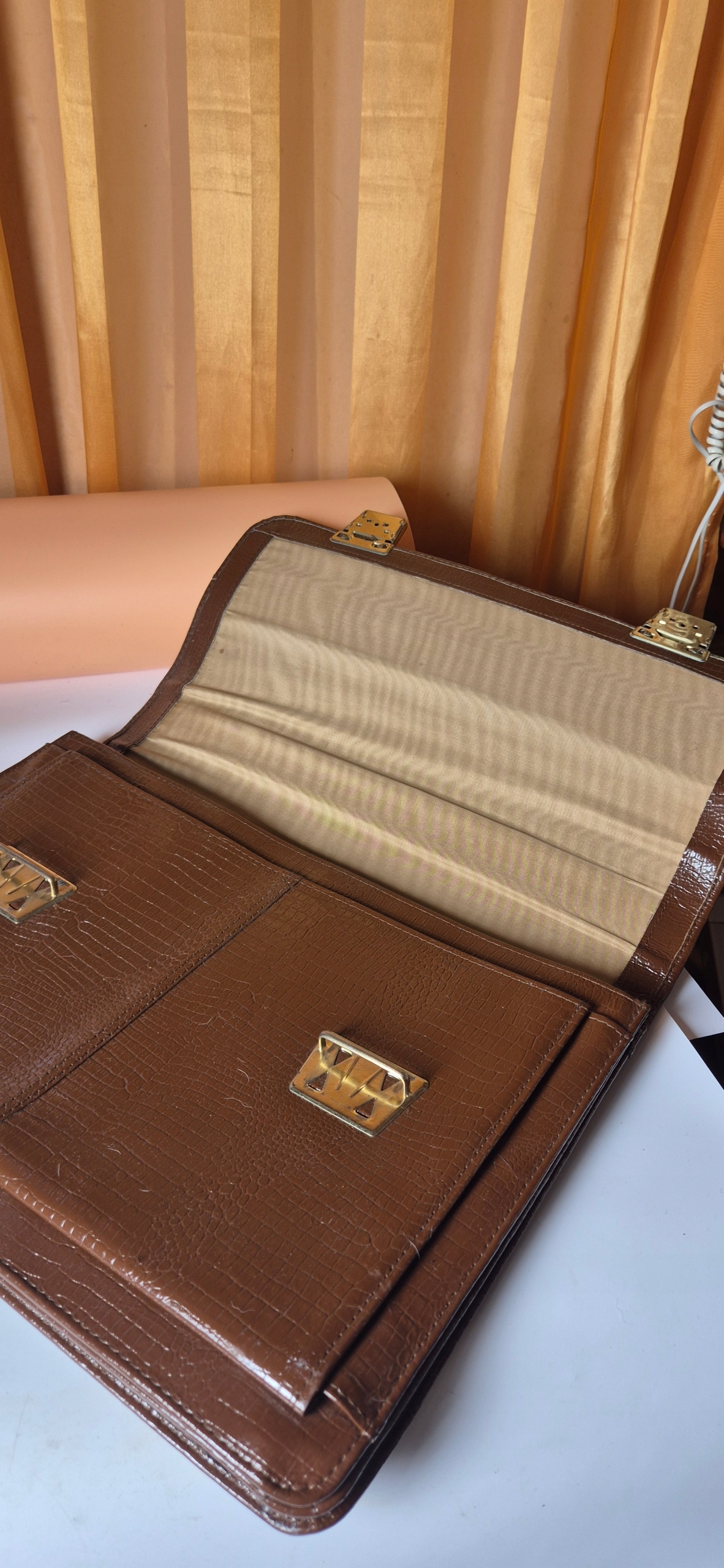 Вінтажний шкіряний портфель 1960-х років, рельєфна шкіра, темно-шоколадний колір, суцільна товста ручка, металеві елементи кольору старого золота, має два відділення всередині