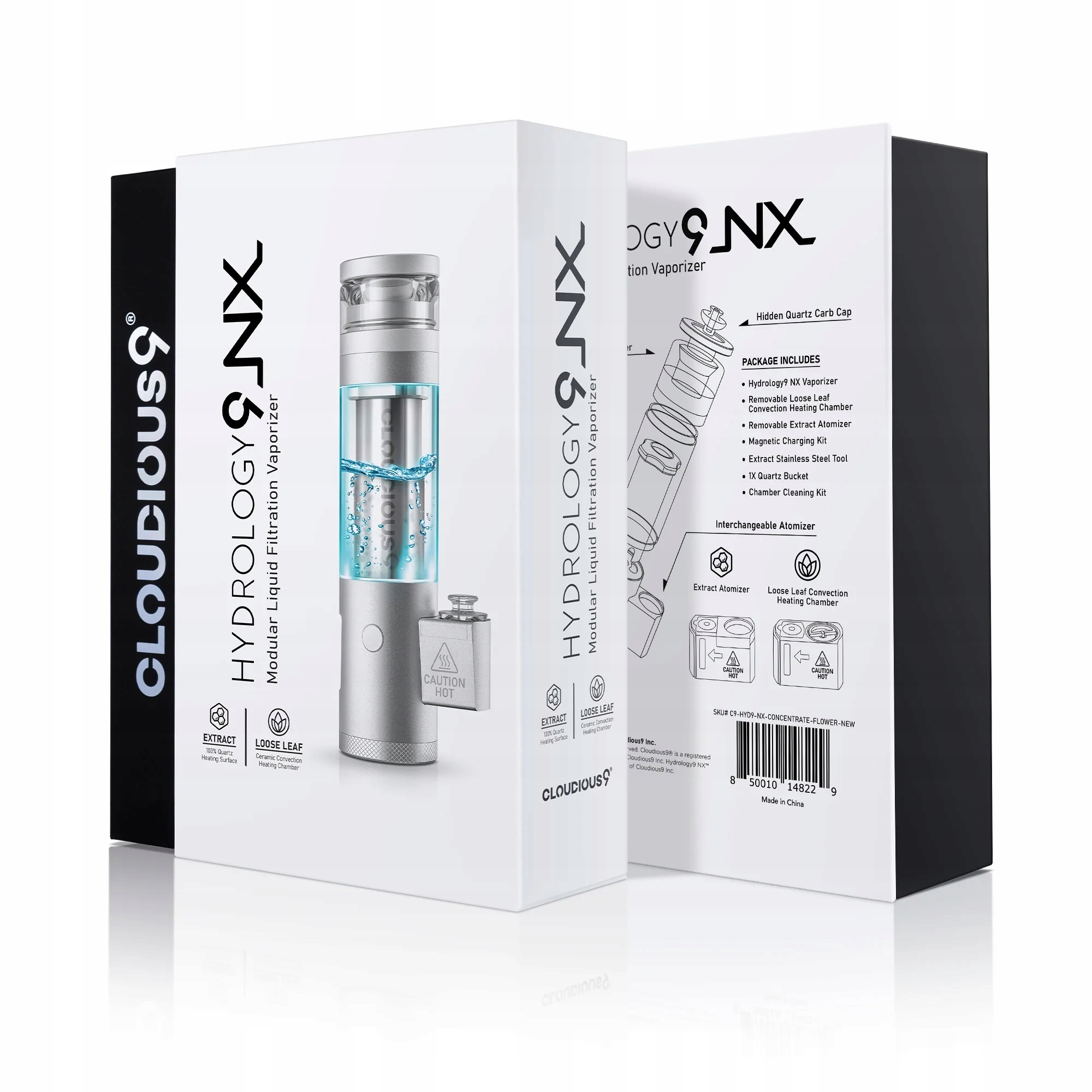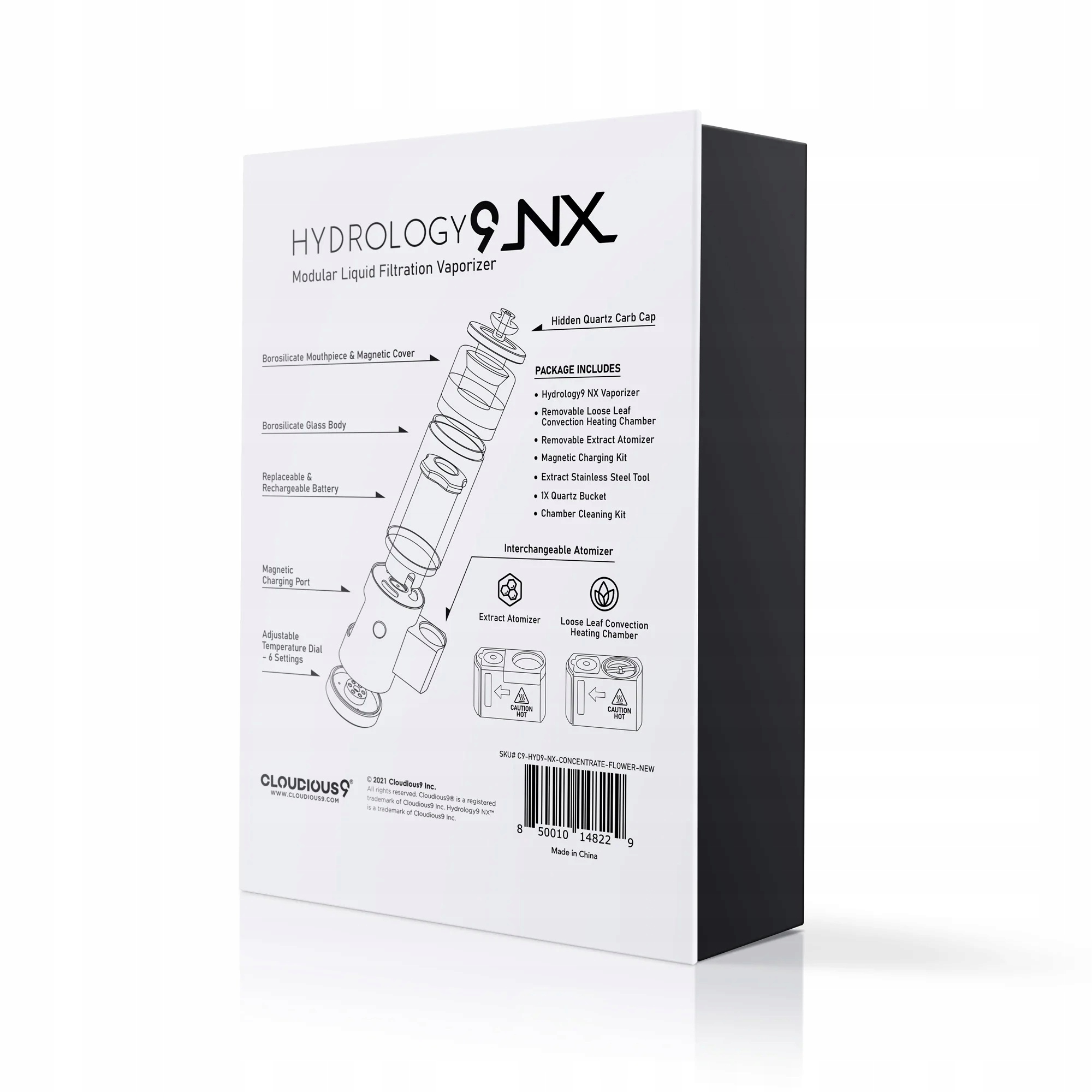 Hydrology 9NX – це електронний випарник з фільтрацією води, призначений для сушених і концентратів. Він має гібридну систему нагріву та герметичну внутрішню камеру, оточену холодною водою для охолодження пари перед вдиханням. Hydrology 9NX є модульним і має 2 змінні камери: одну для сушених трав і одну для концентратів. Він досить малий і легкий, щоб його було легко переносити, а його дизайн дуже стриманий.