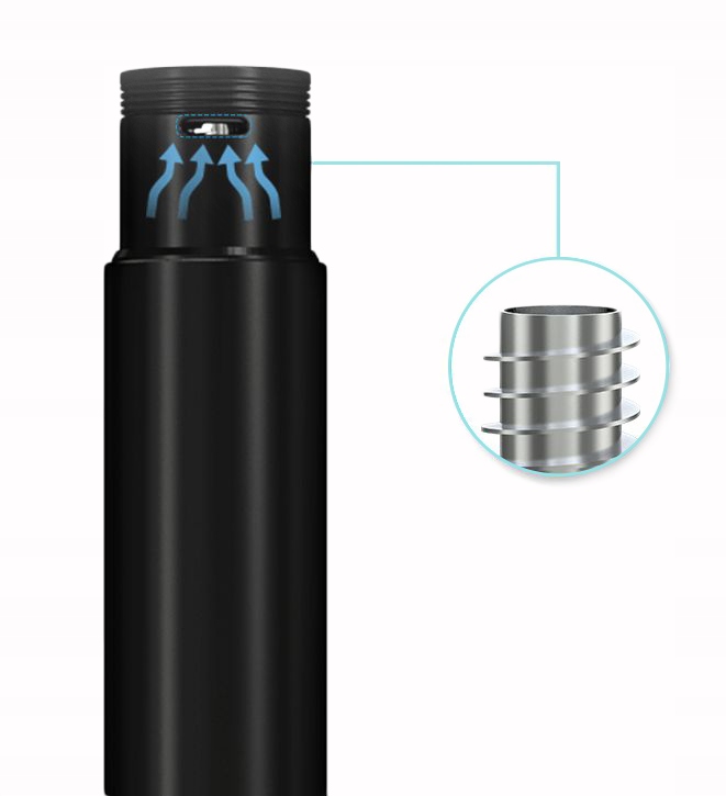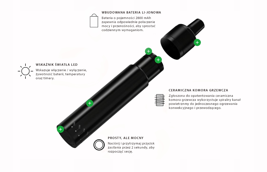 VLeaF — це випарник потужністю 45 Вт. Він досягає бажаної температури протягом 30 секунд. Має п'ять налаштувань температури. Нагрівальна камера використовує спіральний повітряний канал для одночасного конвективного та кондуктивного нагріву. Розміри: Висота - 145 мм Діаметр - 27 мм Вага 137 г. Акумулятор ємністю 2800 мАг.