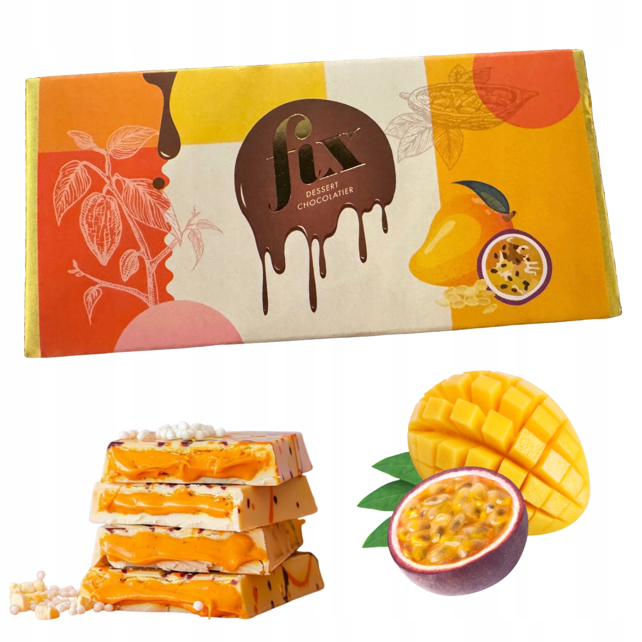 4 Виправити десертний шоколад - час до манго - це унікальна пропозиція від авторитетного виробника Fix Desert Chocolatier.Цей ексклюзивний шоколад - це справжня подорож до світу екзотичних ароматів. Делікатний білий шоколад приховує оксамитову начинку манго та пристрасних фруктів, що вражає інтенсивністю та свіжістю. Весь збагачений цукерками для стрільби, які додають унікальну забаву та легкість кожному укусу.