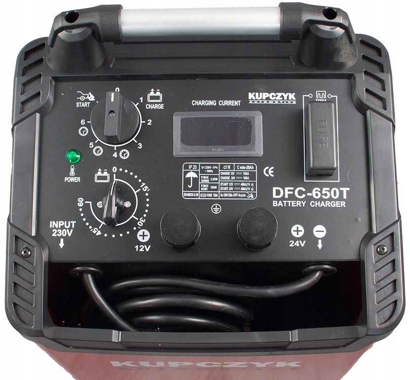 Зарядний пристрій Kupczyk DFC-650T розроблений для зарядки свинцево-кислотних акумуляторів струмом 12В або 24В. і для запуску легкових автомобілів, мікроавтобусів, автобусів з бензиновими і дизельними двигунами, невеликих вантажівок і легкої будівельної техніки. Прилад оснащений інтуїтивно зрозумілою панеллю управління з практичним електронним дисплеєм. На панелі є зручні перемикачі: 12В/24В, кнопки повільної та швидкої зарядки та кнопка запуску. Крім того, випрямляч має запобіжник, який захищає від перевантаження. Додатковими перевагами пристрою є колеса, які полегшують транспортування зарядного пристрою, і передня кишеня для приховування кабелів.