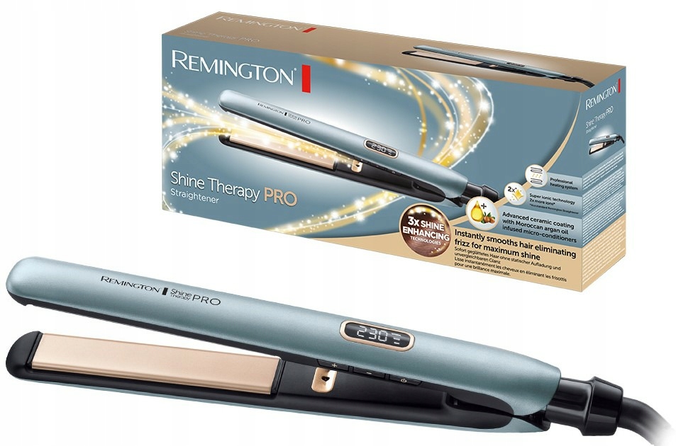Ідеально пряме та живе волосся? Ви можете досягти ідеального ефекту, обравши професійний випрямляч REMINGTON Shine Therapy Pro S9300, який гарантує безпечну та надзвичайно ефективну укладку. Поєднання трьох інноваційних технологій в одному пристрої забезпечить вам максимальний блиск і ідеальний фініш вашої зачіски. Арганова олія, що виділяється з пластин випрямляча, розгладить пасма, максимально їх живлячи, подвійна іонізація, гарантована використанням технології Super Ionic, ефективно запобігає електризації волосся, а рівномірний розподіл тепла забезпечить ідеальне розгладження пасом.