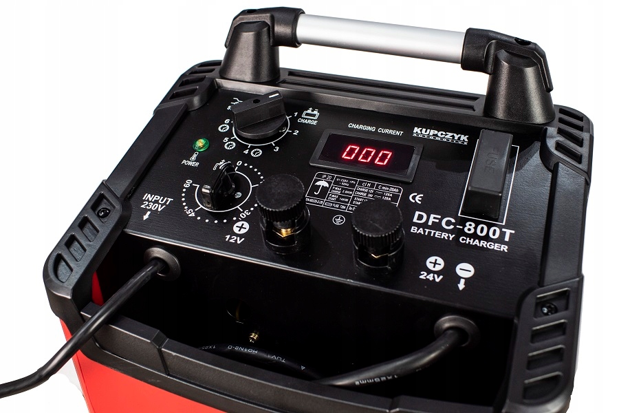 Зарядний пристрій Kupczyk DFC-800T розроблений для зарядки свинцево-кислотних акумуляторів струмом 12В або 24В. і для запуску легкових автомобілів, мікроавтобусів, автобусів з бензиновими і дизельними двигунами, невеликих вантажівок і легкої будівельної техніки. Прилад оснащений інтуїтивно зрозумілою панеллю управління з практичним електронним дисплеєм. На панелі є зручні перемикачі: 12В/24В, кнопки повільної та швидкої зарядки та кнопка запуску. Крім того, випрямляч має запобіжник, який захищає від перевантаження. Додатковими перевагами пристрою є колеса, які полегшують транспортування зарядного пристрою, і передня кишеня для приховування кабелів.