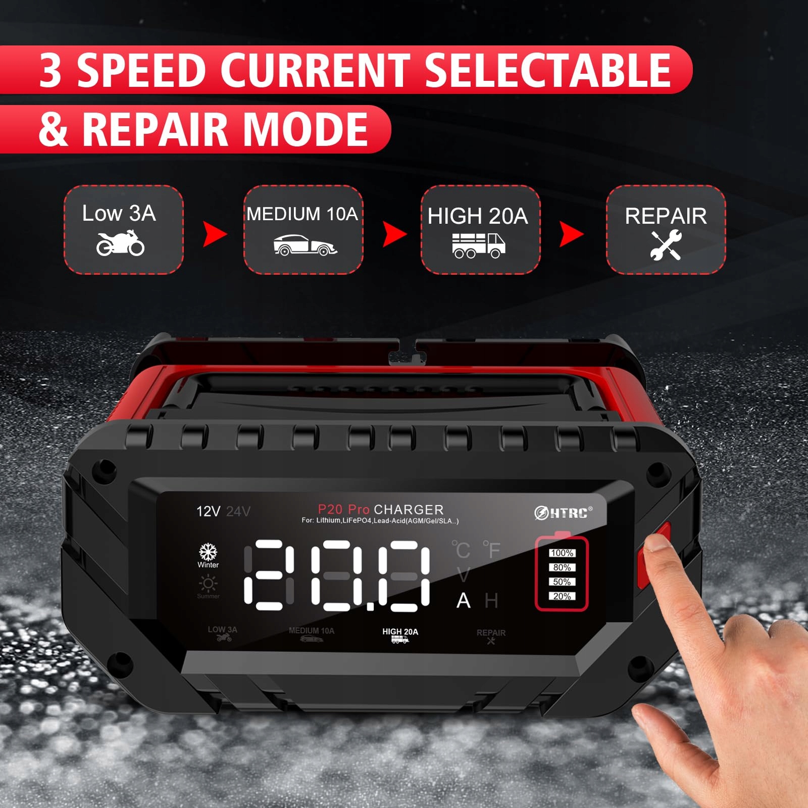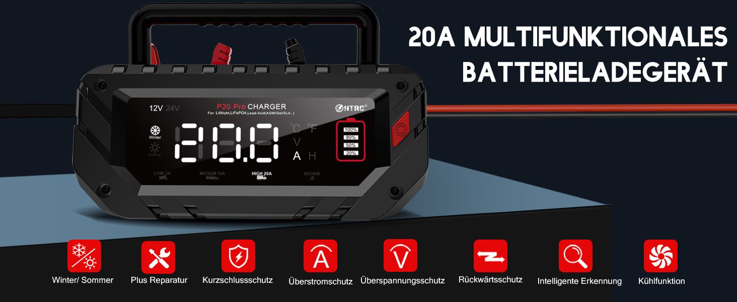 HTRC Smart зарядка зарядки акумулятора - це всебічний пристрій зарядки акумулятора. Він був оснащений універсальними функціями зарядки, завдяки якому нам не потрібно купувати кілька випрямляторів для зарядки акумуляторів у різних технологіях та з різними напругами! Він підтримує батареї 12 В та 24 В, виготовлені в: WET, AGM, GEL, EFB, CA/CA, LITHIUM та LIFEPO4. Немає іскрів при роботі з зарядним пристроєм, немає коротких схем і перевантажень.