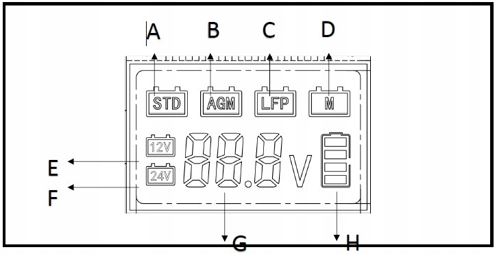 A - 12 В STD: зарядка стандартної свинцево-кислотної батареї 12 В до 14,5 В. 24 В STD, до 29 В, зарядка стандартної свинцево-кислотної батареї 24 В.