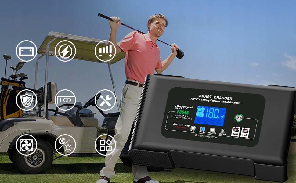 【Широке застосування】Зарядні пристрої на 36 В і 48 В підходять для автомобілів, мотоциклів, човнів, гольф-карів, EZGO TXT, фургонів, вантажівок, сільськогосподарських транспортних засобів, кораблів, водних мотоциклів, газонокосарок, скутерів, позашляховиків тощо. Вони можуть заряджати літієві батареї, батареї LiFePO4, свинцево-кислотні батареї (AGM, GEL, MF, EFB, WET, VRLA, SLA тощо). Один зарядний пристрій підходить для більшості акумуляторів. Зарядні пристрої 36 В і 48 В підходять для автомобілів, мотоциклів, човнів, гольф-карів, EZGO TXT, фургонів, вантажівок, сільськогосподарських транспортних засобів, кораблів, водних мотоциклів, газонокосарок, скутерів, позашляховиків тощо. Можна заряджати літієві батареї, батареї LiFePO4, свинцево-кислотні батареї (AGM, GEL, MF, EFB, WET, VRLA, SLA тощо). Один зарядний пристрій підходить для більшості акумуляторів.