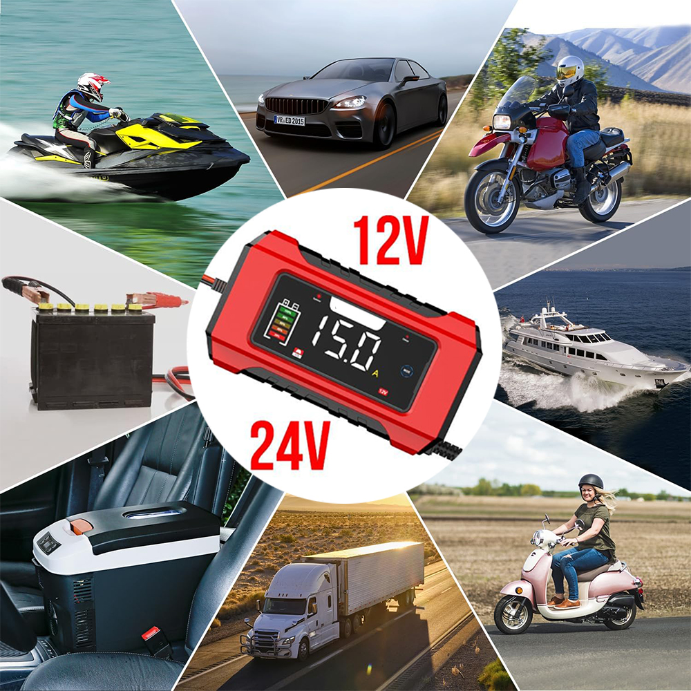- ✔️Сумісність із усіма свинцево-кислотними батареями 12 В/24 В і акумуляторами глибокого циклу (такими як AGM, STD, GEL, Wet, MF, EFB), які використовуються у вантажівках, газонокосарках, кемперах, позашляховиках, UTV, Квадроцикли.