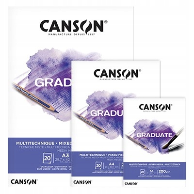 Блоки Canson змішані носії для випускників мають білий , міцний, злегка зернистий папір. 20 аркушів із вагою 200 г/м², ідеально підходить для змішаних методик, гарантуючи отримання оптимальних результатів. Блок склеюється на короткій стороні. Задня кришка, виготовлена з густого картону. Документ кислий і має сертифікат FSC