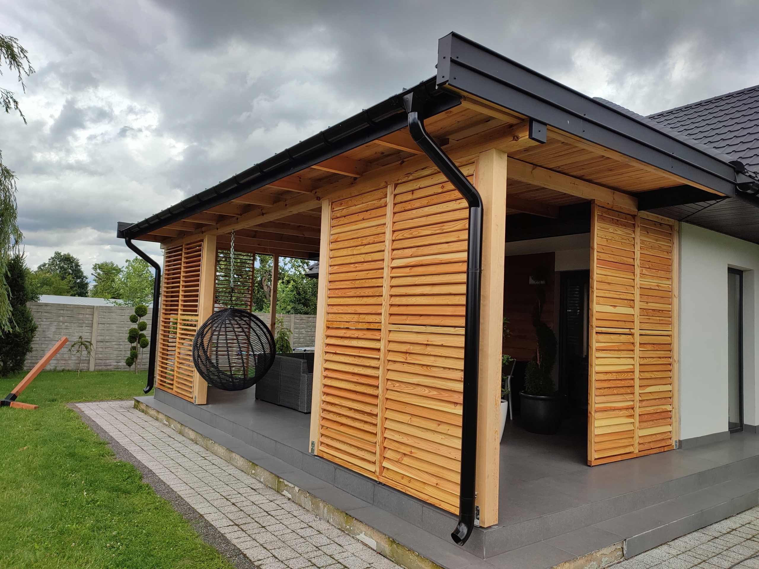 Залежно від кута нахилу ламелей, ми можемо вільно регулювати кількість світла, що потрапляє на терасу або садову перголу. Управління ламелями здійснюється вручну, тобто, взявшись за лопатку жалюзі, ми пересуваємо весь механізм окремого модуля по всій його висоті.