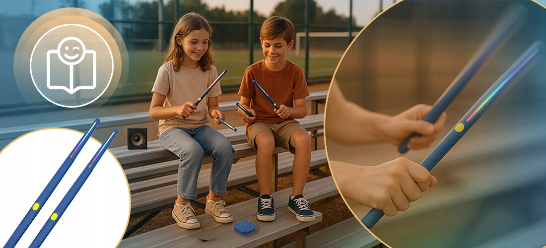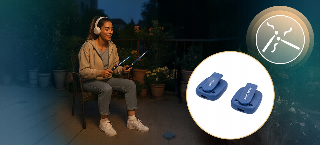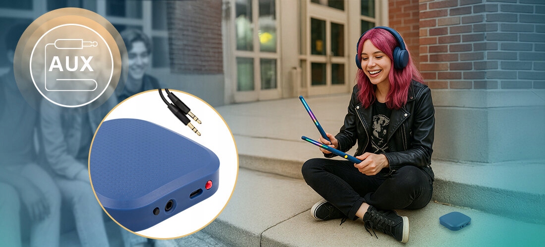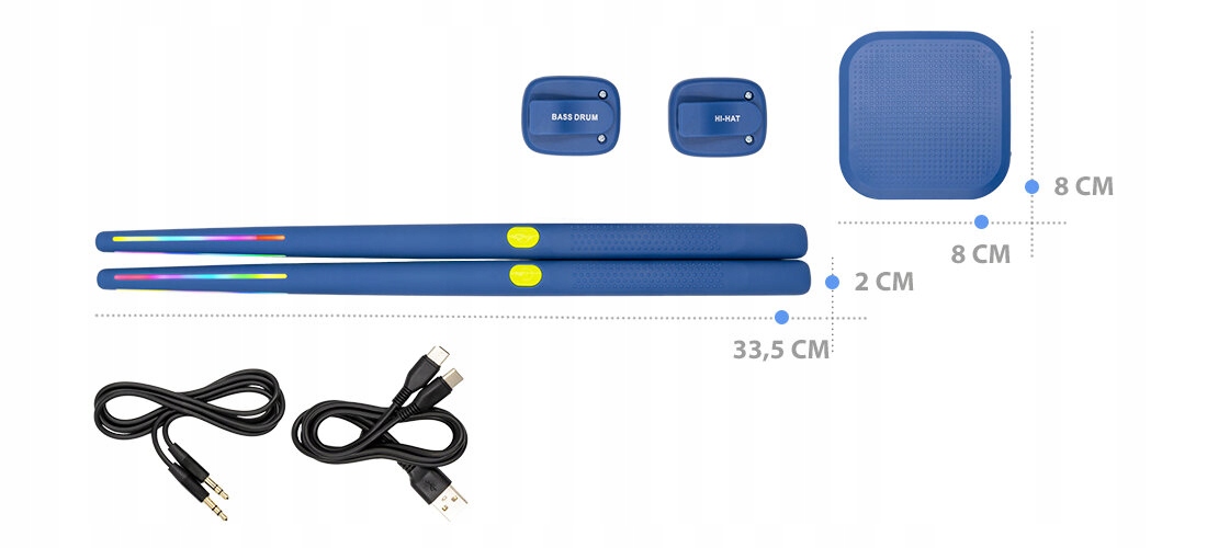 живлення від заряджених акумуляторів, набір повністю бездротовий - без кабелів, що обмежують рухи. Ви граєте де завгодно: у кімнаті, на відкритому повітрі, на ходу. Завдяки виходу Aux 3,5 мм ви можете підключити навушники або динамік і негайно почути наслідки вашої гри. Набір не потребує конфігурації або спеціалізованої звукової системи - все, що вам потрібно, - це з'єднання з будь -яким аудіо -пристроєм для введення в ритм.