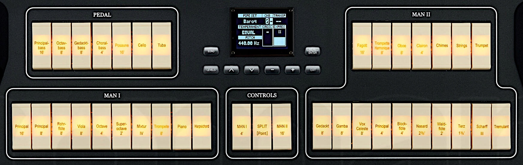 - До кожного регістру можна призначений для вибору одного з 6 органних голосів відповідно до потреб органіста