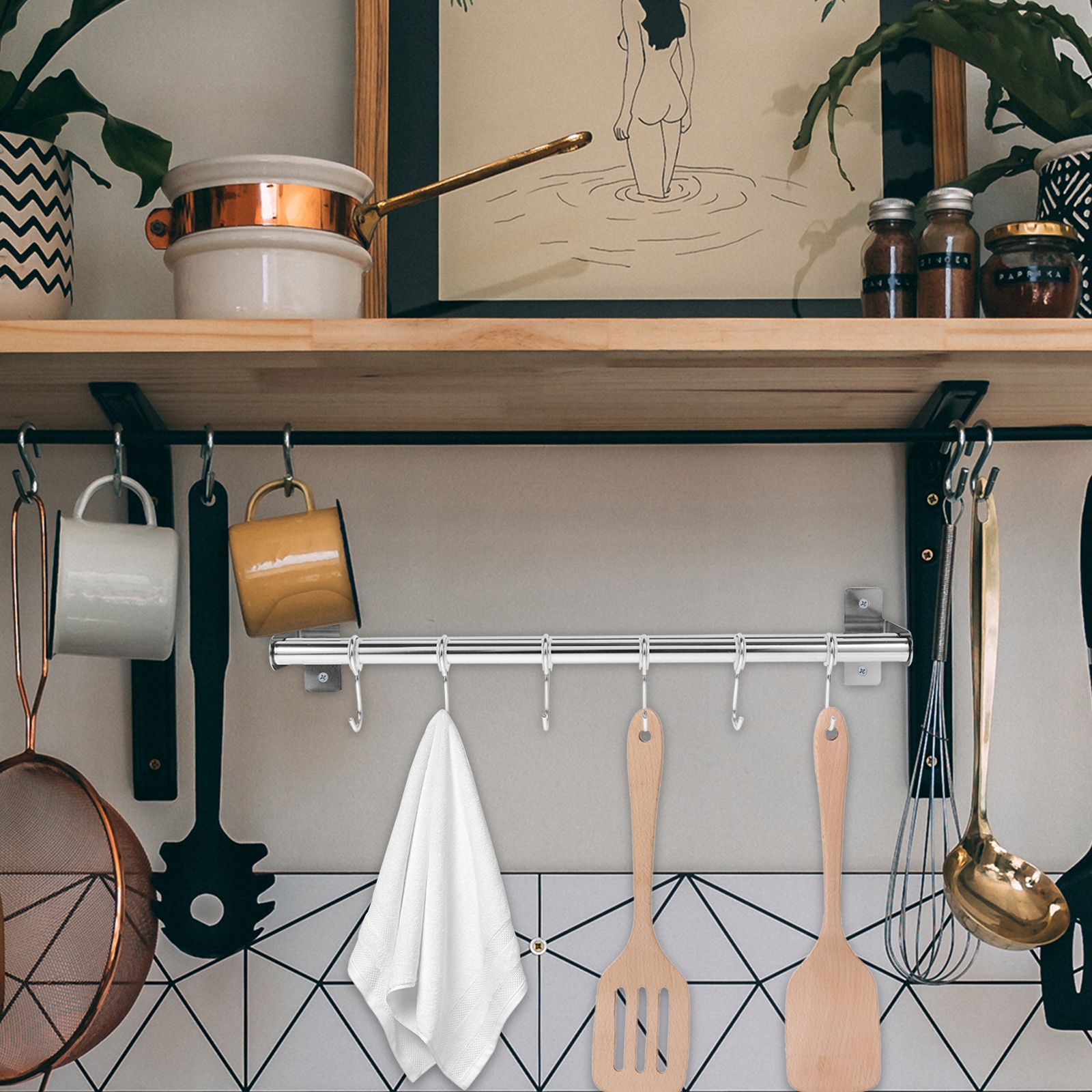 ✅ Це подвійна підставка з нержавіючої сталі, яка виготовлена з матеріалу, водонепроникної та стійкої до іржі. Його будівництво для настінного монтажу не тільки дозволяє зберігати рушники та кухонний начиння, але й добре вписується в кухню та прикрасу ванної кімнати. Підходить для висячого кухонного посуду, тканин, рушників, пальто, шапки, сумки, парасольки, прання та клавіш.