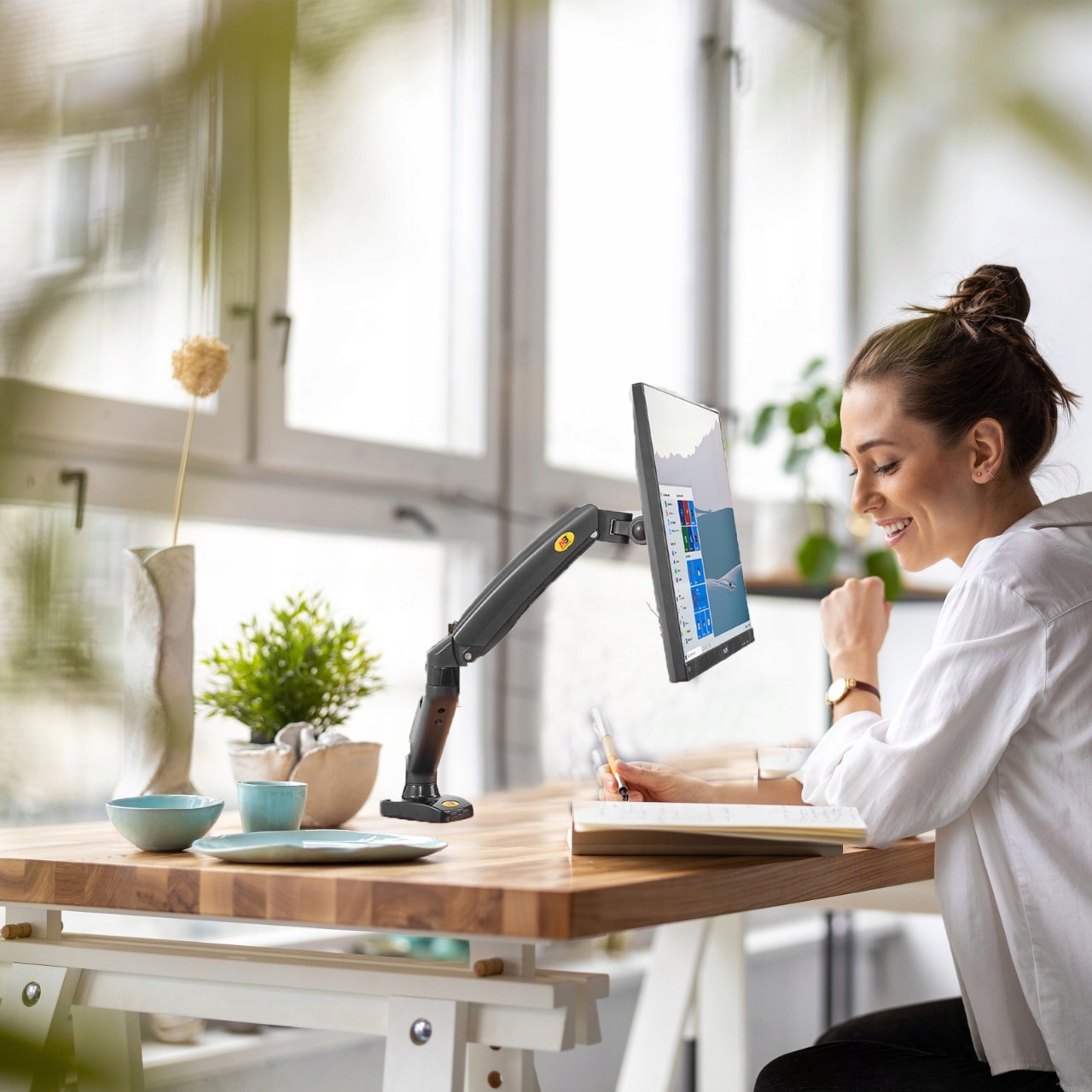 Тримач — ідеальне рішення для економії цінного місця на вашому столі. Завдяки можливості підйому монітор підвішується на відповідній висоті, що не тільки візуально збільшує робочий простір, але й забезпечує більш естетичний вигляд робочої станції. Це дає вам змогу вільно користуватися рештою столу та полегшує утримання його в чистоті.
