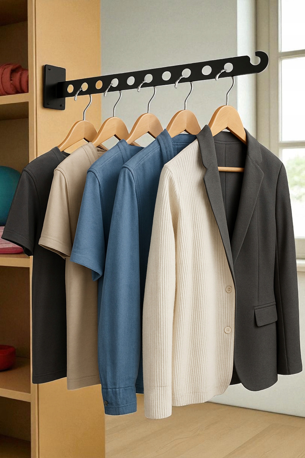 - Функціональність: дозволяє зберігати вішалки для одягу, що економить місце в гардеробі.