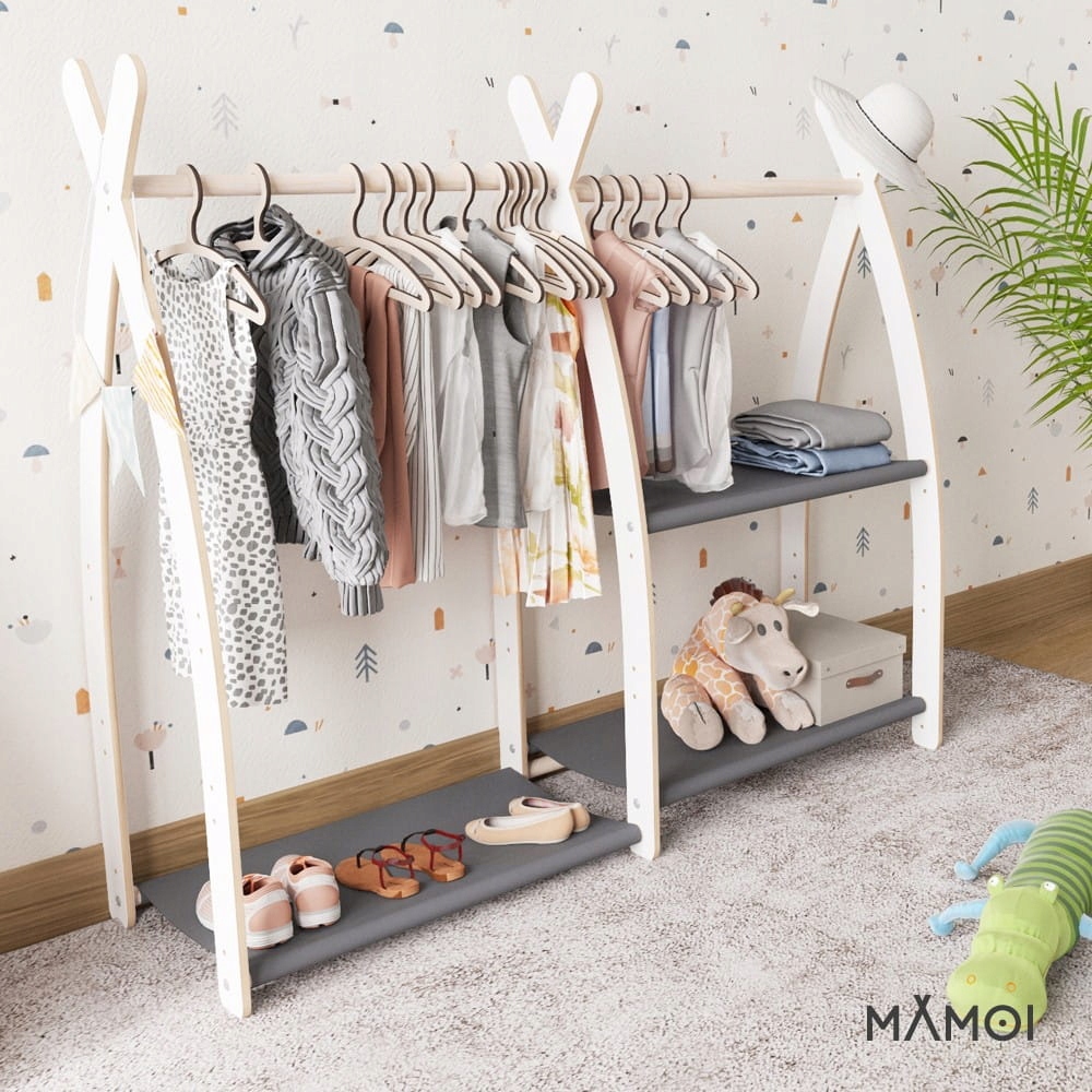 Шафа призначена для самостійного монтажу згідно з інструкцією, що додається. Перед використанням перевірте міцність вішалки. Дерев'яні частини можна чистити м'якими миючими засобами та злегка вологою тканиною; тканину можна прати. Вішалка для дитячого одягу призначена для використання в приміщенні. Його слід захистити від несприятливих погодних умов. Виробник не несе відповідальності за недотримання правил зберігання товару.
