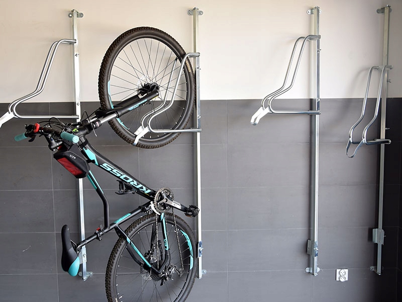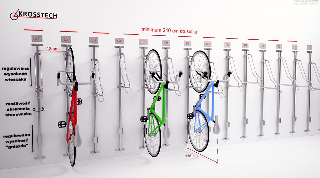 Вішалка для велосипедів для будівництва великих велосипедних кімнат. Повністю регульований (вгору-вниз/ліворуч-праворуч) - дозволяє регулювати положення відповідно до ваших уподобань. Крім того, станцію підвіски можна переміщати горизонтально, що значно полегшує знімання та паркування велосипеда, особливо коли відстані між станціями невеликі. Вішалка також доступна з кільцем, яке дозволяє кріпити велосипед до рами (за додаткову плату). Вішалка пройшла випробування під навантаженням і отримала позитивний висновок Інституту технічного нагляду.
