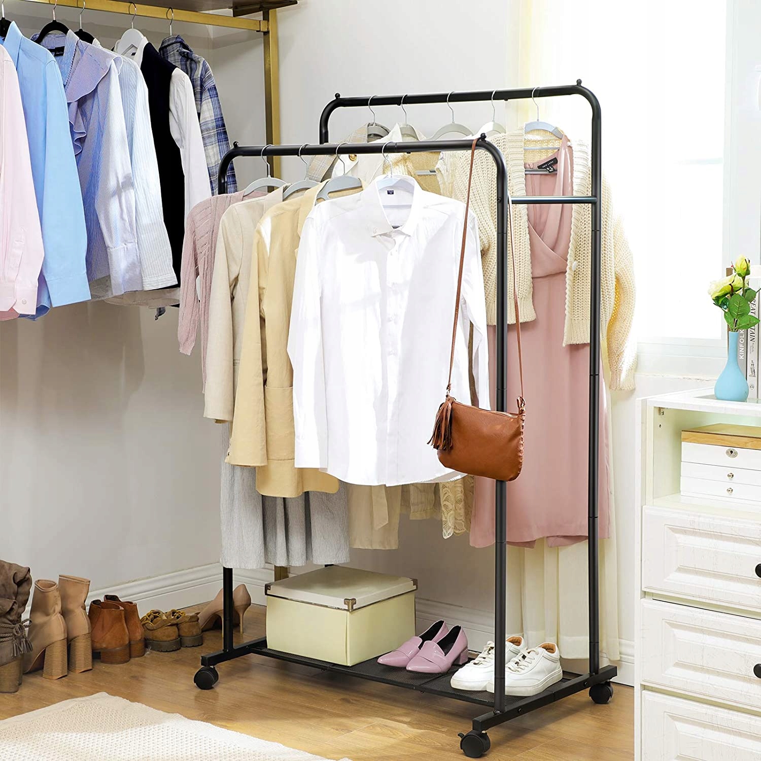 Миттєва гардеробна для блискучого одягу: шукаєте розумне рішення для зберігання одягу з купою? Ви знайшли його! Ця вішалка для одягу з двома напрямними забезпечує додатковий простір для повсякденних потреб, займаючи мало місця. Крім того, нижня сітчаста полиця готова для взуття, сумок і ящиків для зберігання.