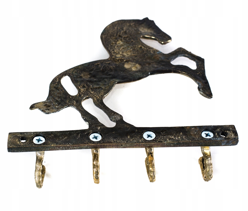 Представляємо вішалку з брикаючою конячкою на 4 гачки. Виріб патинований, на відкритих місцях переполірований, в кутах темніший. Все це покрито безбарвним лаком для запобігання окисленню латуні. Суцільне лиття. Польський товар - підтримуємо польські ремесла.