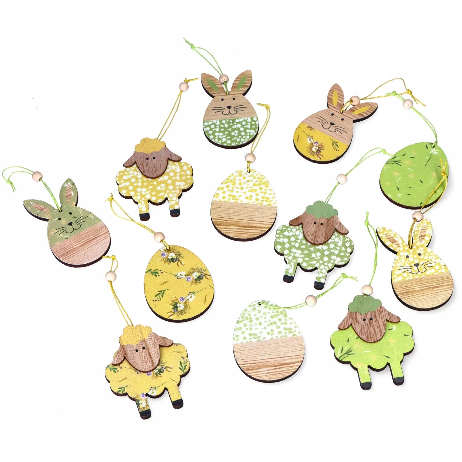 Великодня підвіска з дерева в дивовижних кольорах і декораціях. Це ідеальний елемент новорічного декору та вносить весняну атмосферу в будь-який інтер'єр. Прикраса доступна у формі: овечки, кролика та пасхального яйця. Довжина однієї підвіски приблизно 9 см.