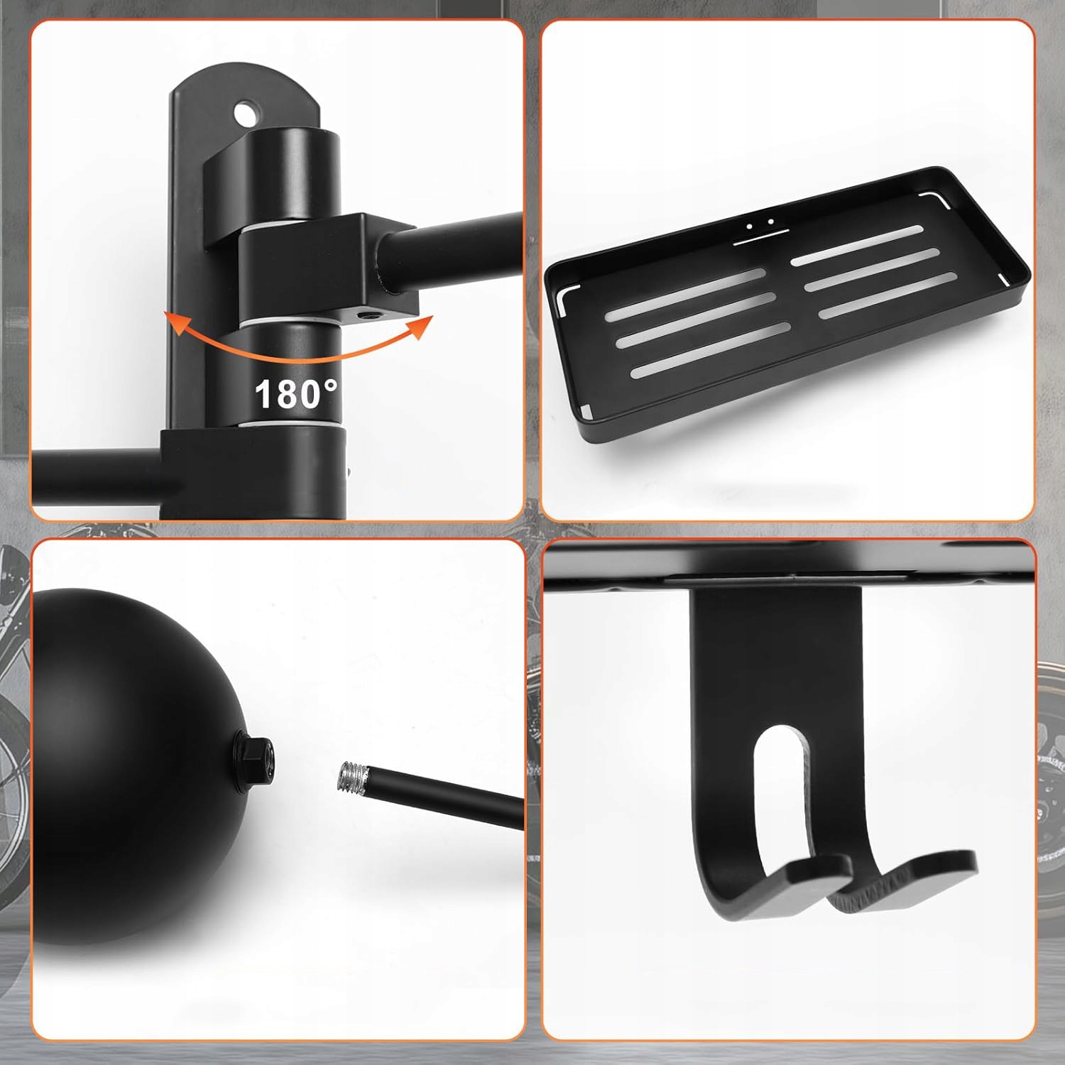Тримач шолома мотоцикла можна повернути на 180°, щоб відрегулювати його у відповідне положення. Ви можете розташувати шолом під різними кутами, а коли він не використовується, його можна нахилити до стіни, щоб зберігати його, уникаючи проблеми з гачками.
