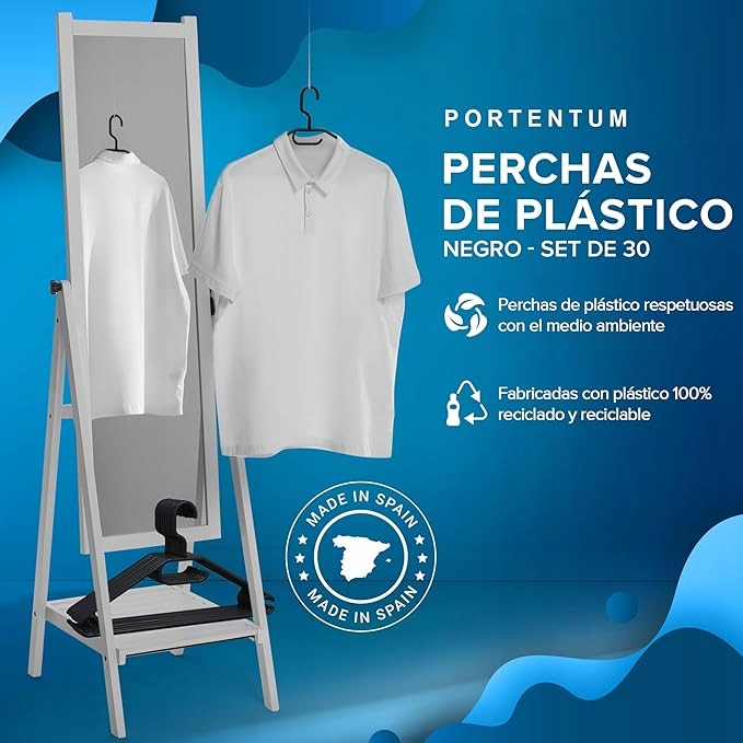 - ЕКОЛОГІЧНО ТА ПЕРЕРОБЛЕННЯ: чорні вішалки виготовлені з 100% переробленого пластику, який придатний для вторинної переробки, що робить їх екологічно чистим варіантом. Зроблено в Іспанії.