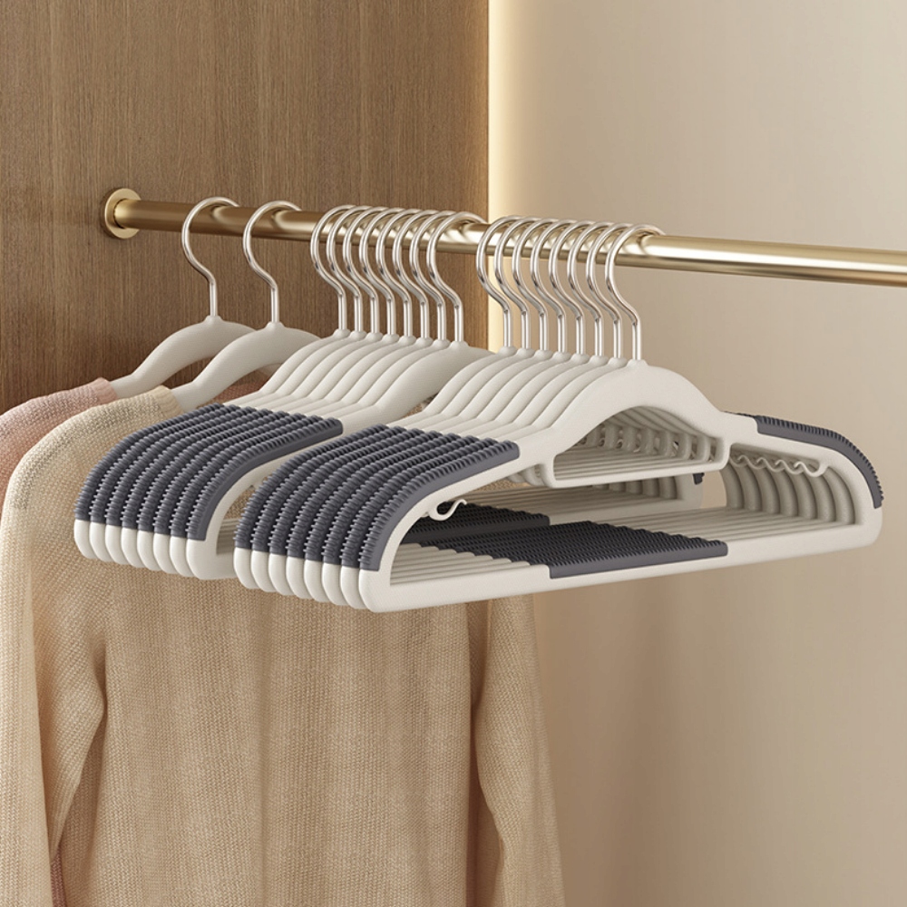 Інвестуйте в елегантні вішалки, які економлять місце, захищають делікатні тканини та запобігають ковзанню одягу. Оснащені гаком, що обертається на 360°, і додатковою перекладиною, вони забезпечують максимальну функціональність.