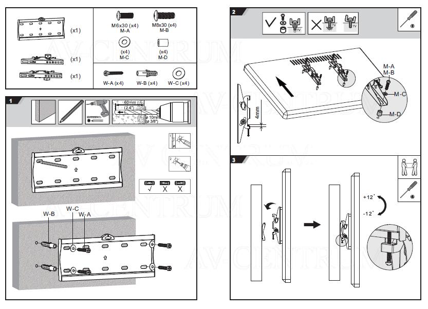 - Набір містить набір кріпильних гвинтів для стіни та для кріплення телевізора та польську інструкцію зі складання