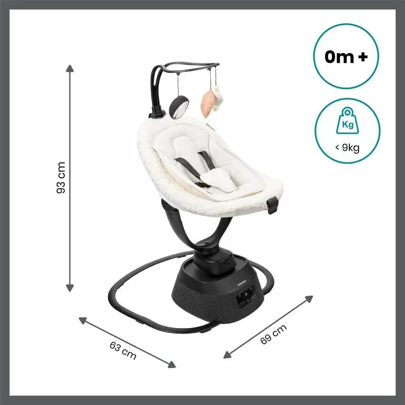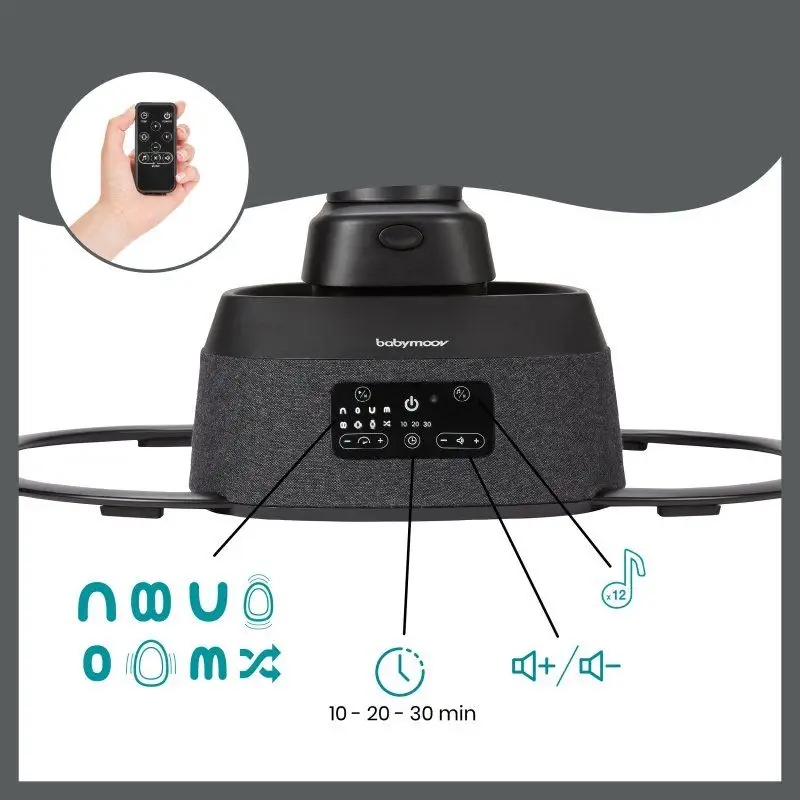 - Включає пульт дистанційного керування для керування рухом гойдання, швидкістю, таймером і музикою