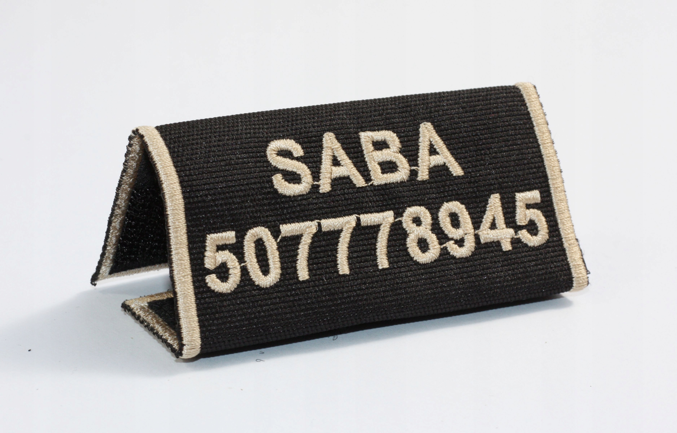 Вишита іменна бирка з вашим текстом (номер телефону, адреса або ім’я), прикріплена за допомогою липучок.
