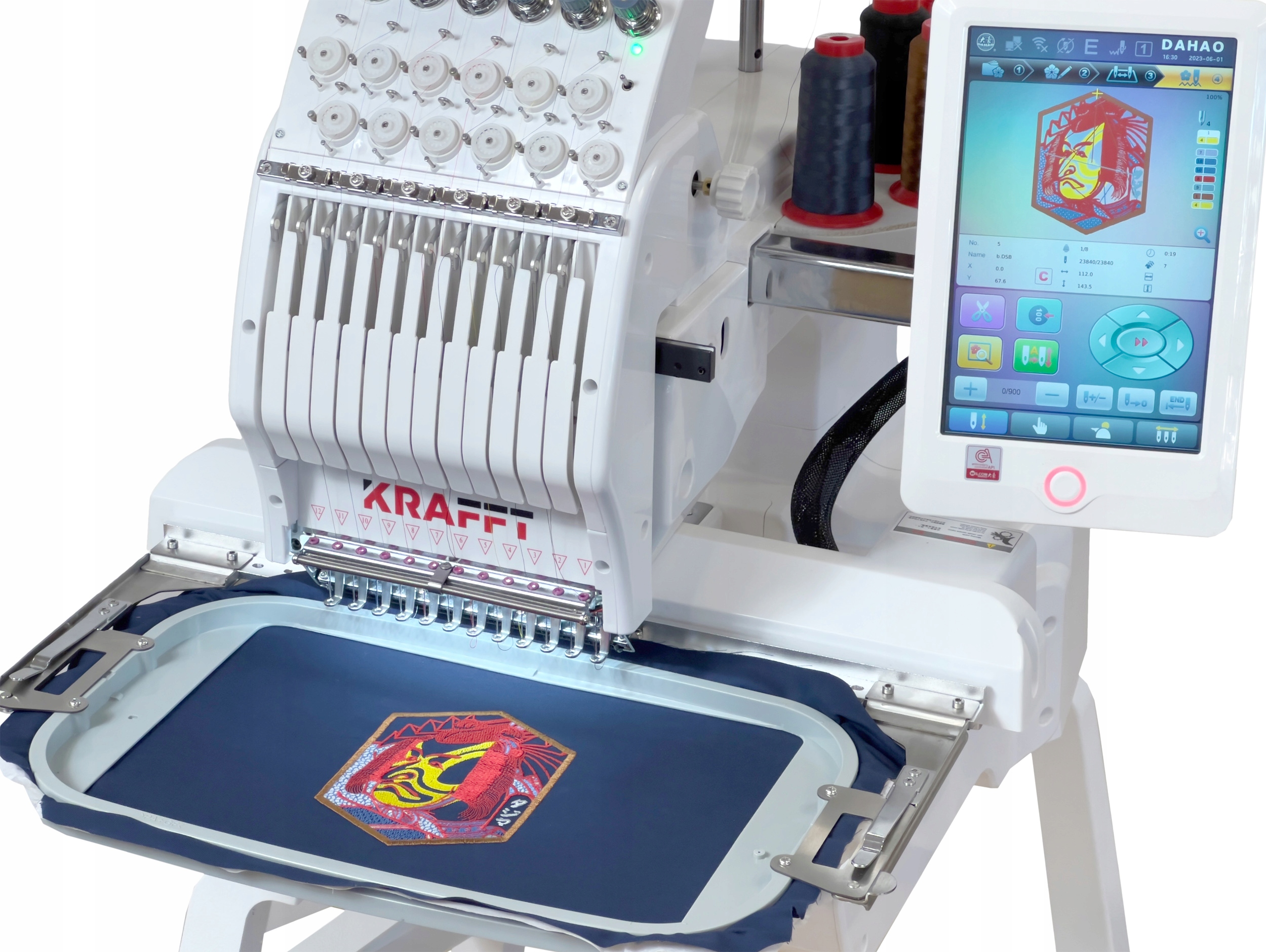Вишивальна машина KRAFFT оснащена великою кольоровою сенсорною панеллю керування 10" із меню польською мовою. Автоматичний запуск і зміна кольору. Дуже висока якість виготовлення та широкі можливості вишивання роблять його придатним для використання в багатьох виробах.
