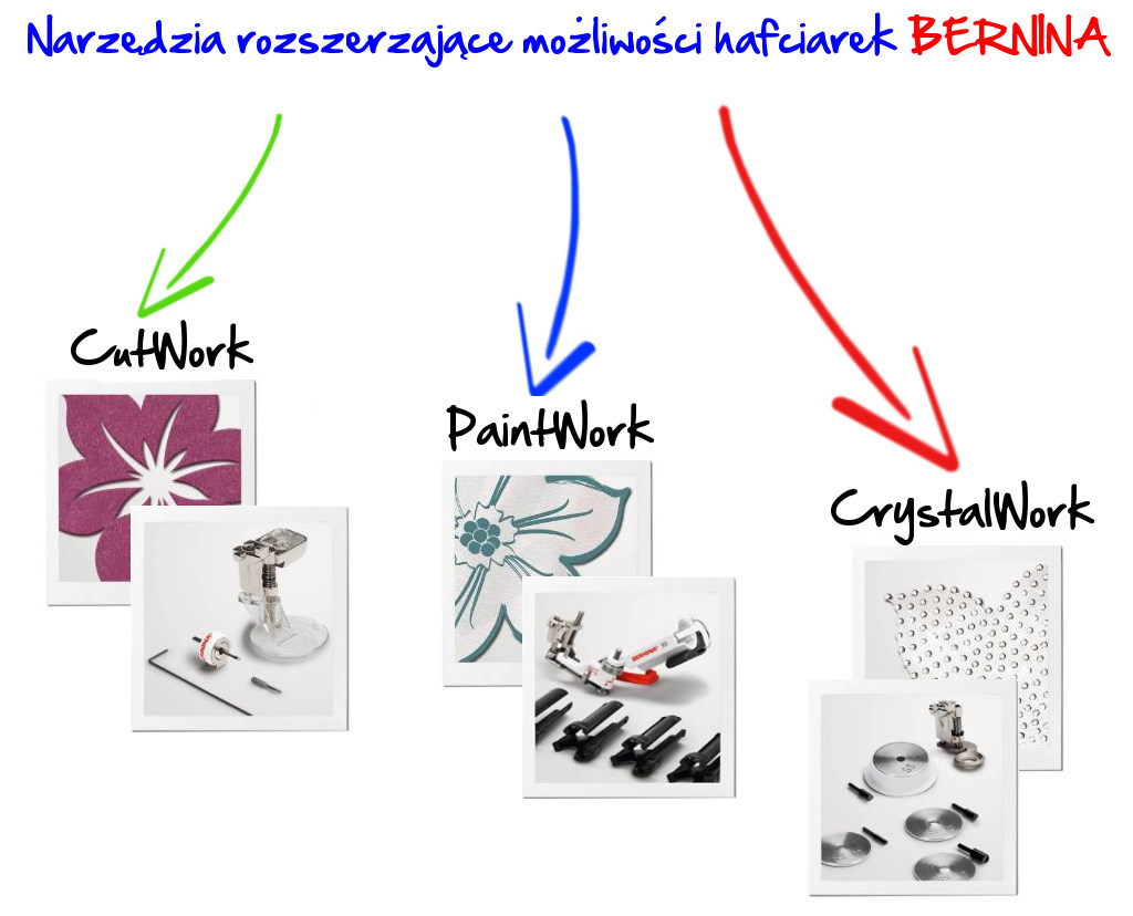 BERNINA CutWork, як і інші набори, що розширюють можливості вишивальних машин BERNINA, засновані на програмному забезпеченні BERNINA DesignWorks. Окремі модулі/інструменти містять ключ, який активує певну функцію в програмі. Маючи один інструмент, ми можемо через деякий час придбати інший і використовувати одну програму для роботи з усіма інструментами, які розширюють можливості вишивальних машин BERNINA. Програма була розроблена максимально інтуїтивно зрозумілою. У програмі ми розробляємо схеми, які потім виготовляємо на вишивальній машині за допомогою спеціального інструменту.