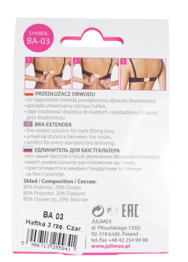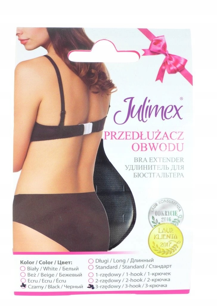 Екстендер для бюстгальтера від великої польської компанії JULIMEX - ідеальне рішення для вузьких окружностей. Його бездоганність підтверджена ВІДКРИТТЯ РОКУ 2016 і КЛІЄНТА LAUR 2017. Він підійде до будь-якого бюстгальтера, тому що доступний у версіях з застібкою на один, два або три гачки, він непомітний і легко надягається - достатньо зачепити гачок за гачок, як з оригінальним обхватом, і дихати буде легше :)